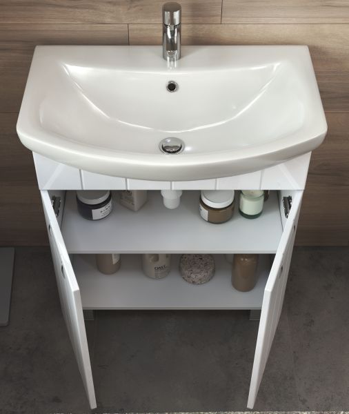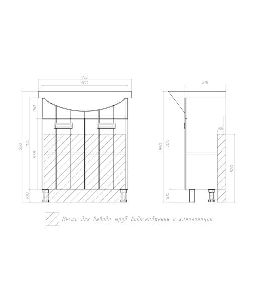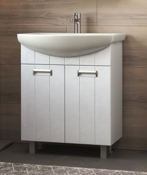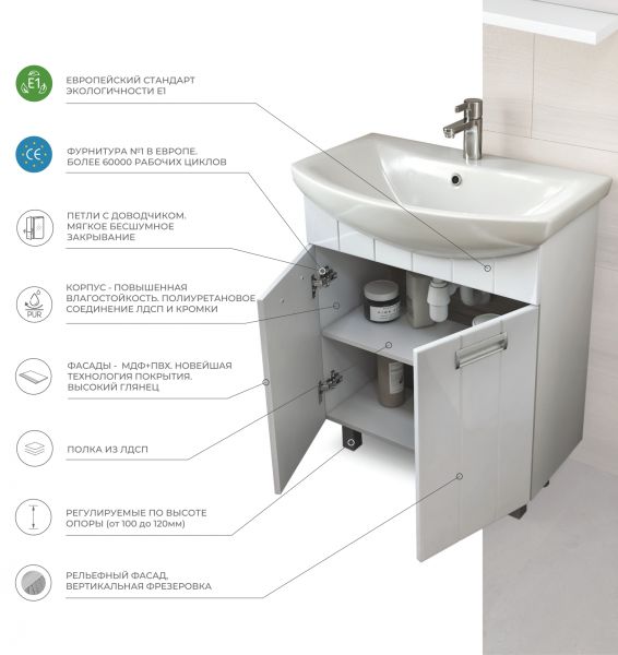 Оснащение: 2 дверцы; 1 полка ЛДСП; ручка врезная металлическая хромированная, опоры квадратные регулируемые.