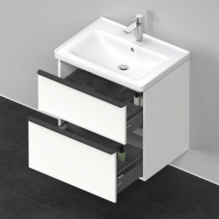 Тумба под раковину Duravit D-Neo DE435401818 подвеснаяDuravit D-Neo DE435401818 Подвесная тумба для раковины 650*480 мм (белый матовый). С 2 выдвижными ящикам, верхний ящик с вырезом для сифона. Раковина в комплект не входит, рекомендована раковина 2367650000. Цвет: белый матт.