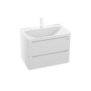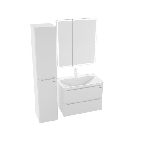 Тумба выполнена из влагостойкого МДФ покрытая белой глянцевой краской, устойчивая к перепадам температур и высокой влажности, крепится к стене и занимает мало места.
