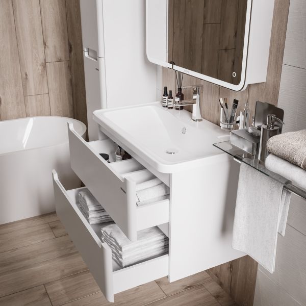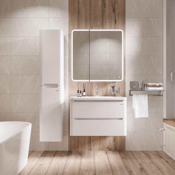 Тумба выполнена из влагостойкого МДФ покрытая белой глянцевой краской, устойчивая к перепадам температур и высокой влажности, крепится к стене и занимает мало места.