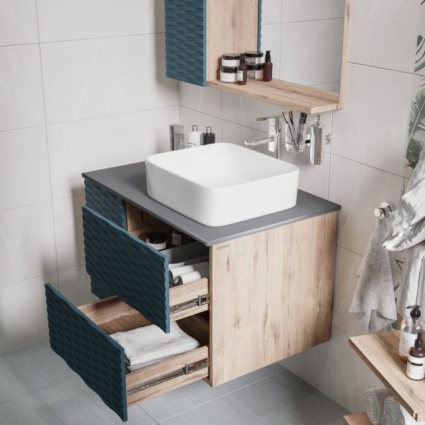 Шкаф-зеркало Альба 80 см отражает современные тенденции в дизайне мебели для ванных комнат: матовая пленка в цвете Бриз с 3D рисунком безупречно сочетается с текстурой под дерево, отсутствие лишних деталей.
