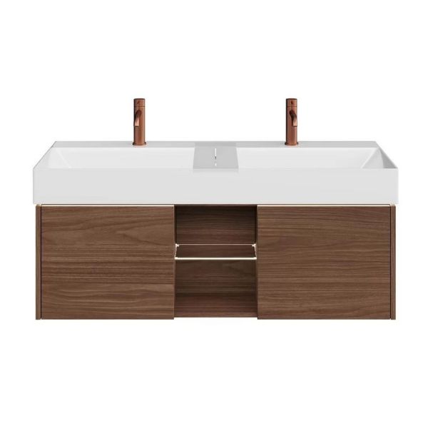 Линейка тумб GRANDE представлена в размере 120 см (габариты 117,8x47x37,3 см). Тумбы в цвете «cтруктурированный орех» предложены в двух вариантах: с тремя ящиками и с двумя ящиками и открытой зоной по центру. Тумбы выполнены из ЛДСП. В тумбах предусмотрено два вида подсветки с сенсорным включением: первая освещает раковину по периметру, вторая установлена между двумя боковыми ящиками и освещает стеклянную полочку из осветлённого стекла. Открытие ящиков реализовано с системой Push-to-Open, простым нажатием на фасад. Внутренняя отделка ящиков – «структурированный орех». Тумба устанавливается только с раковинами GRANDE. В комплектацию входят: гарантийный талон, крепления, инструкция по установке, алюминиевый профиль.