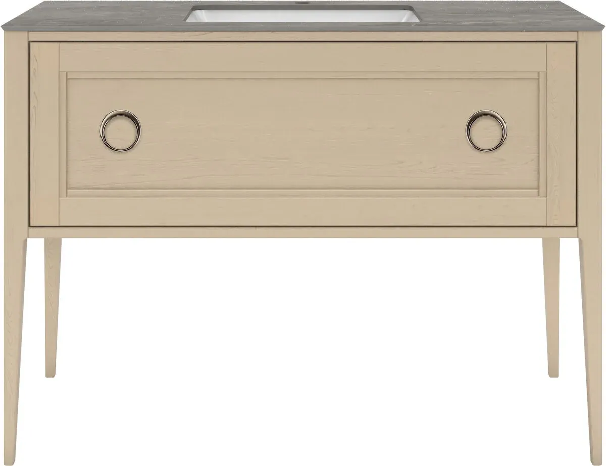 Напольная тумба с одним выдвижным и одним внутренним ящиками выполнена из массива ясеня с отделкой «открытая пора». Вместительный ящик с плавным закрыванием украшен двумя крупными ручками. Сочетается с керамическими столешницами PLAZA Classic шириной 120 см. Подходит для установки раковин с типом монтажа «накладная на столешницу» и «встраиваемая сверху».