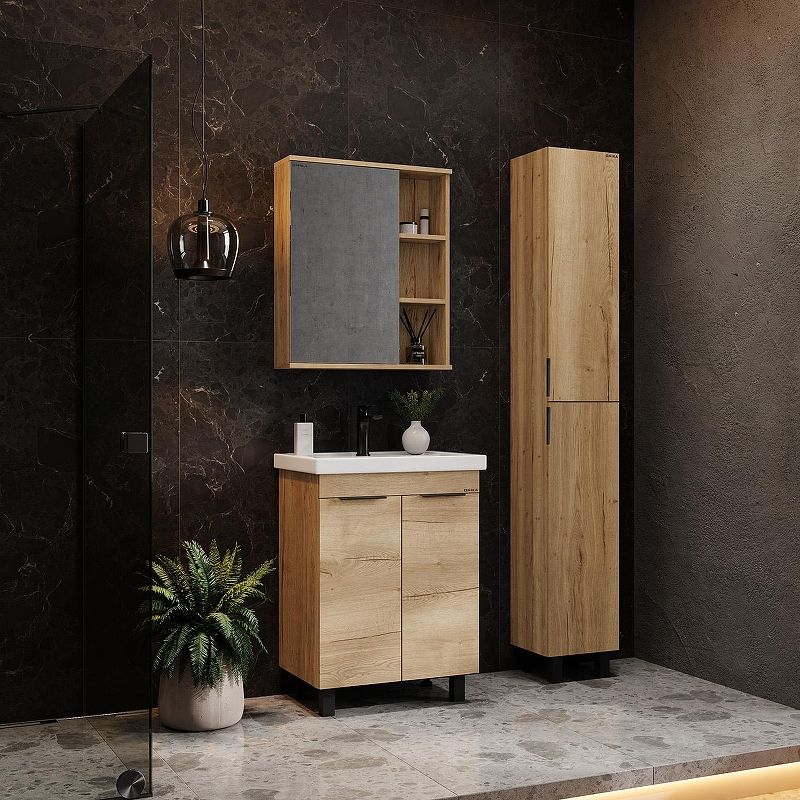 Напольная тумба для ванной комнаты Onika Легран 70 - это сочетание насыщенного древесного декора и благородства металла: роскошная текстура и натуральный цвет дуба дают теплоту, а черная матовая фурнитура добавляют урбанизма и солидности.