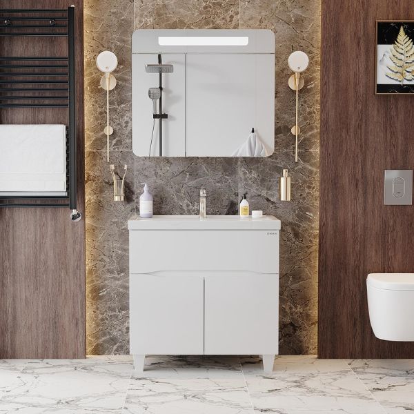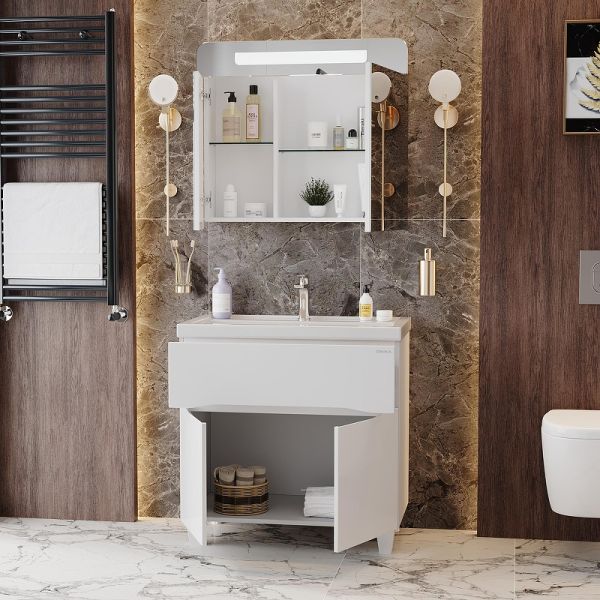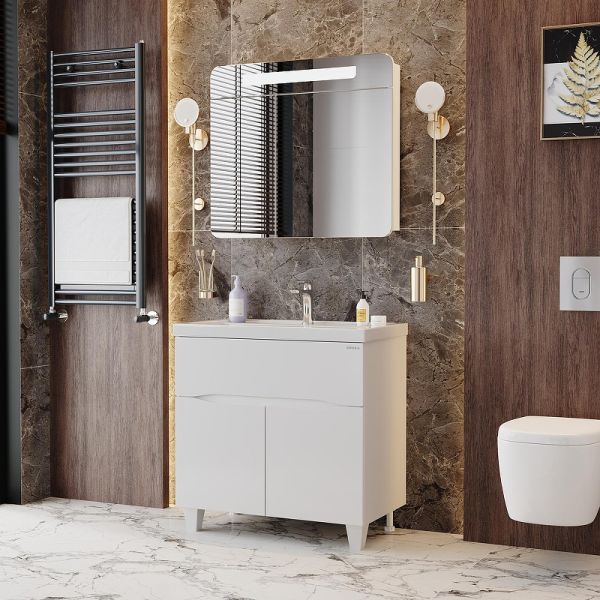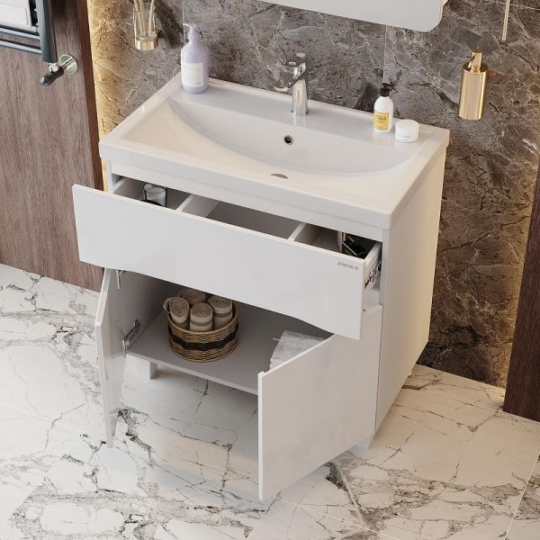 Яркая эстетика строгих линий и блестящий белый глянец - тумба Onika Стрим 80 создана, чтобы наполнить пространство воздухом и сделать особенный свободный интерьер комнаты.