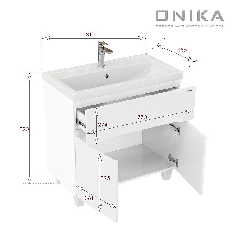 Ящик тумбы сконструирован с разделением внутреннего и подсифонного пространства и оснащен направляющими с доводчиками, а дверцы снабжены системой плавного закрывания.