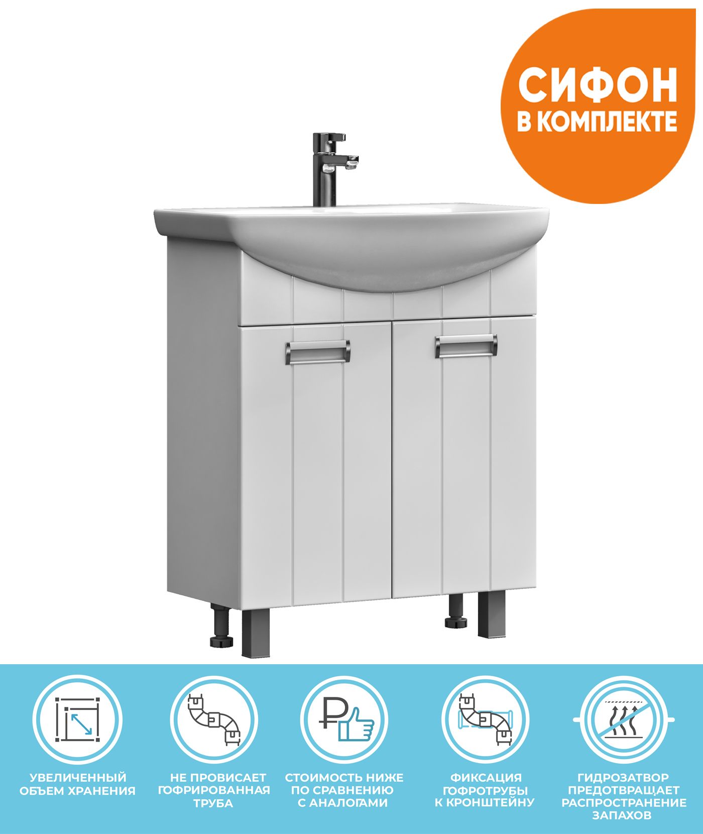 2 дверцы; 1 полка ЛДСП; ручка врезная металлическая хромированная, опоры квадратные регулируемые.Специальный сифон Vigo в комплектеМатериал корпуса: влагостойкая ЛДСПМатериал фасадов: ЛМДФПокрытие: пленка ПВХДверцы: петли с механизмом плавного закрыванияЯщики: направляющие полного выдвижения.