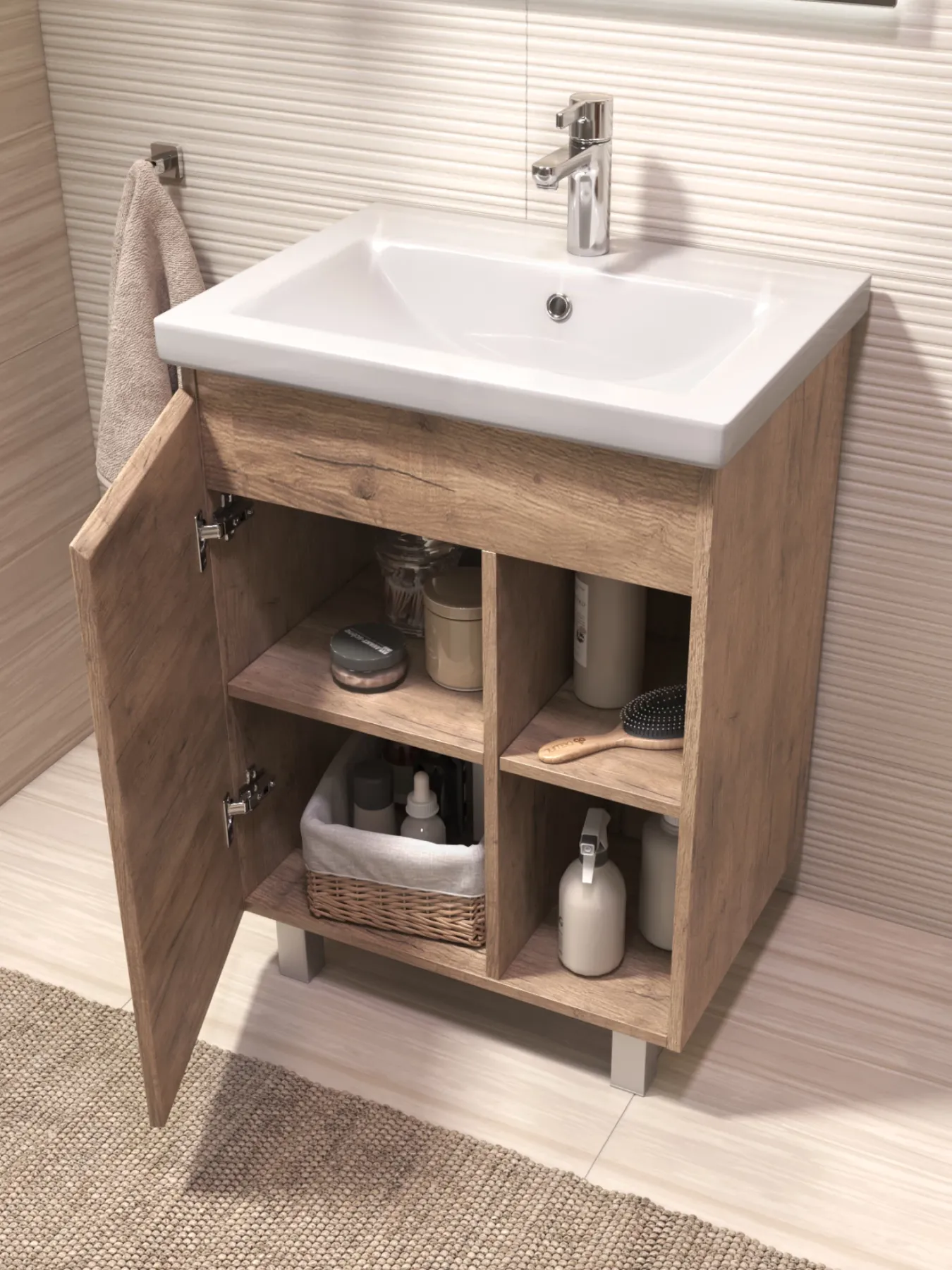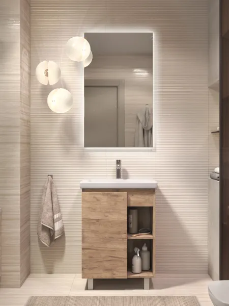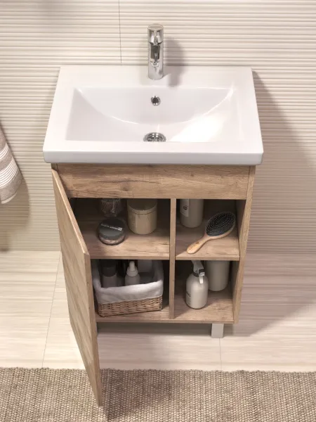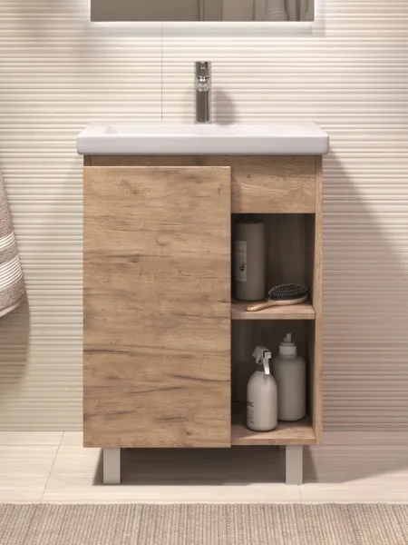 Тумба Milos 60, напольная, 1 дверца, дуб золотой (под ракоовину Como 60). Оснащение: 1 дверца, петли с механизмом доводчика, 2 полки ЛДСП, 4 опоры квадратные регулируемые. Колекция VIGO MILOS: петли с доводчиком, полки из влагостойкой ЛДСП, толщина 16 мм, интегрированные ручки, декор материала с имитацией под дерево.