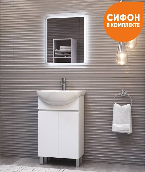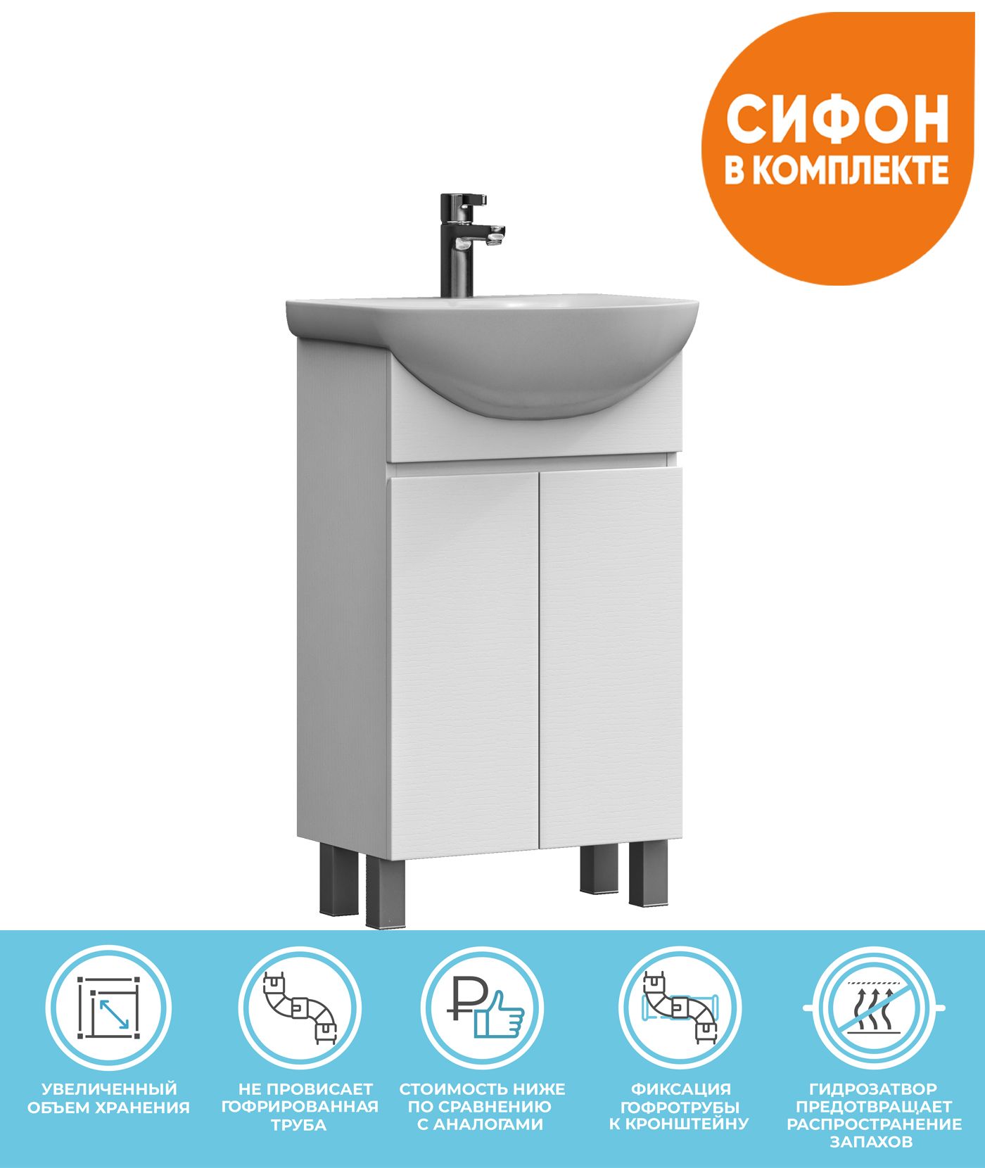 2 дверцы, 1 полка ЛДСП, опоры регулируемые квадратные. Специальный сифон Vigo в комплекте.Материал корпуса и фасада: влагостойкая ЛДСПДверцы: петли с механизмом плавного закрыванияОтсутствие лицевой фурнитуры – интегрированная в фасад ручка