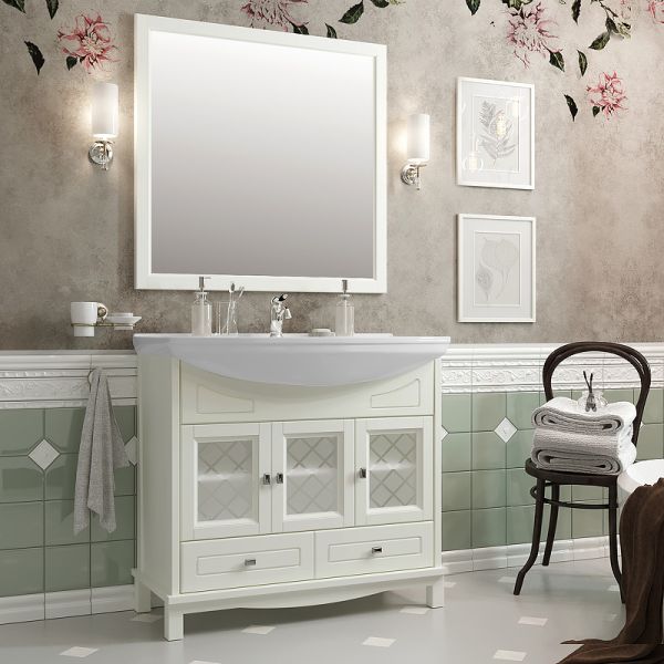 Тумба под раковину Opadiris Омега 85 00-00002824. Элегантные и лаконичные формы изделия идеально впишутся в любой интерьер в стиле прованс. Фасадные элементы украшены оригинальными ромбовидными узорами стеклянных витражей.Характеристики:Цвет: слоновая кость.