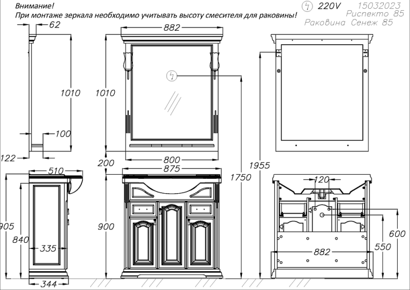 Габариты корпуса тумбы (ШхВхГ): 822х900х332 мм.