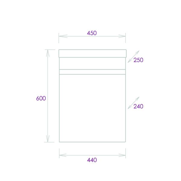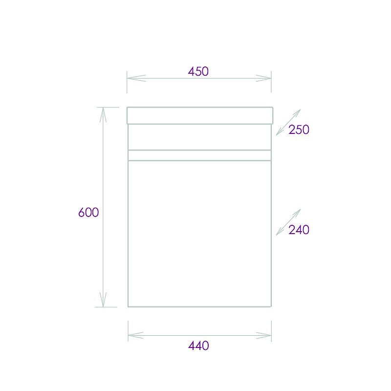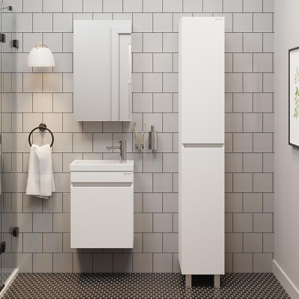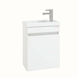 Тумба имеет белый глянцевый фасад и строгие формы без декора. За дверцей с интегрированной ручкой скрывается пространство с полкой для размещения необходимых бытовых принадлежностей.