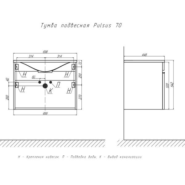 Тумба под раковину подвесная Velvex Pulsus tp.PUL.PUL.70.1Y белый глянец, 70 см: 1 выдвижной ящик.