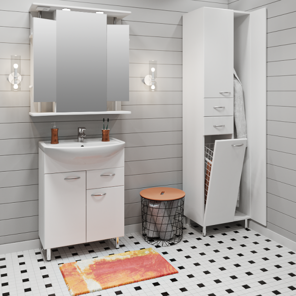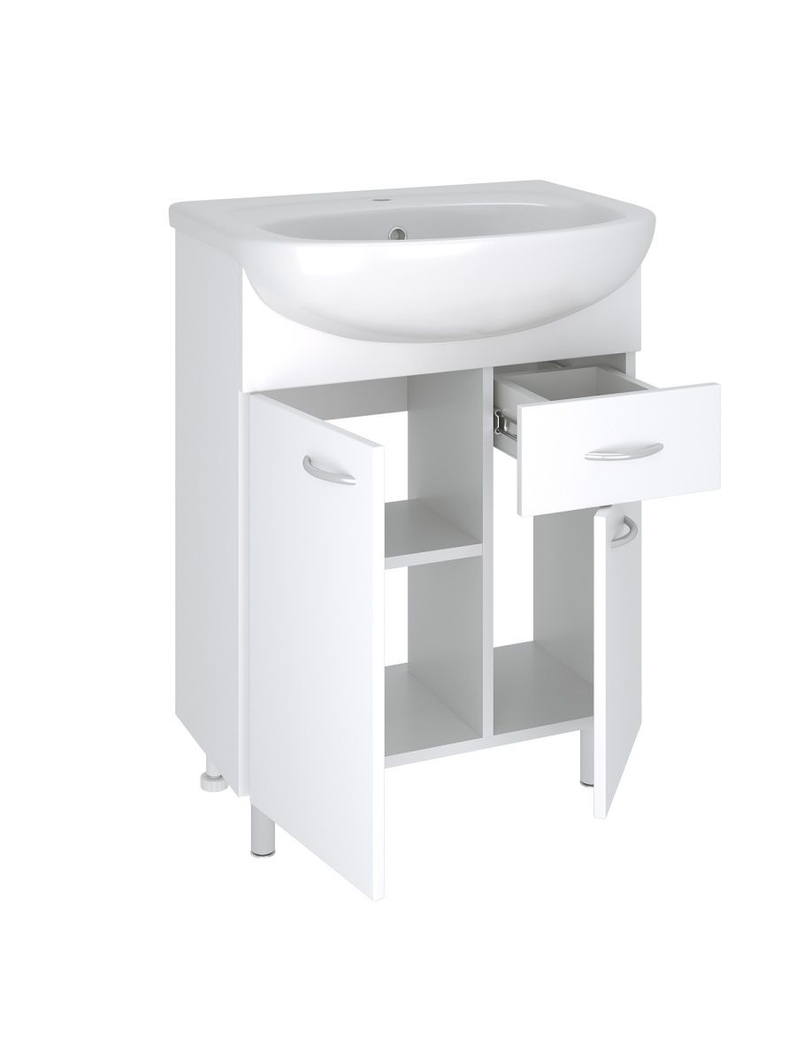 Тумба под умывальник напольная с двумя распашными фасадами и боковым выдвижным ящиком справа. За левым фасадом - одна внутренняя полка. Ящик - на шариковых направляющих, петли со встроенным доводчиком, ручки - 3шт, ножки хром - 2 шт, ножки пластик -2шт.