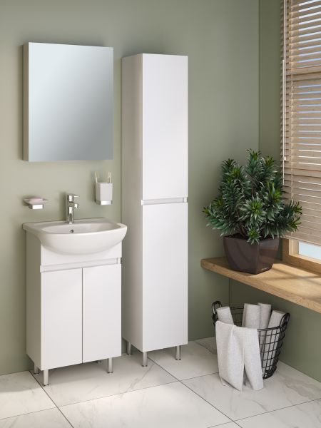Тумба с раковиной RUNO ЛАДА - модное и оригинальное решение для бюджетного оснащения ванной комнаты. Тумба под раковину ЛАДА (напольная) выполнена в двух цветах - классическом белом и в стильном цвете - графит/серый дуб . Тумба в ванную имеет две распашные дверцы и одну внутреннюю полку. В комплекте идут петли со встроенным доводчиком, 2 хромированные и 2 пластиковые ножки. Тумба для ванной комплектуется керамической раковиной "Уют" (500*420 мм). Раковина имеет глубину 18 см. Мебель для ванной RUNO - красота и практичность в мелочах!