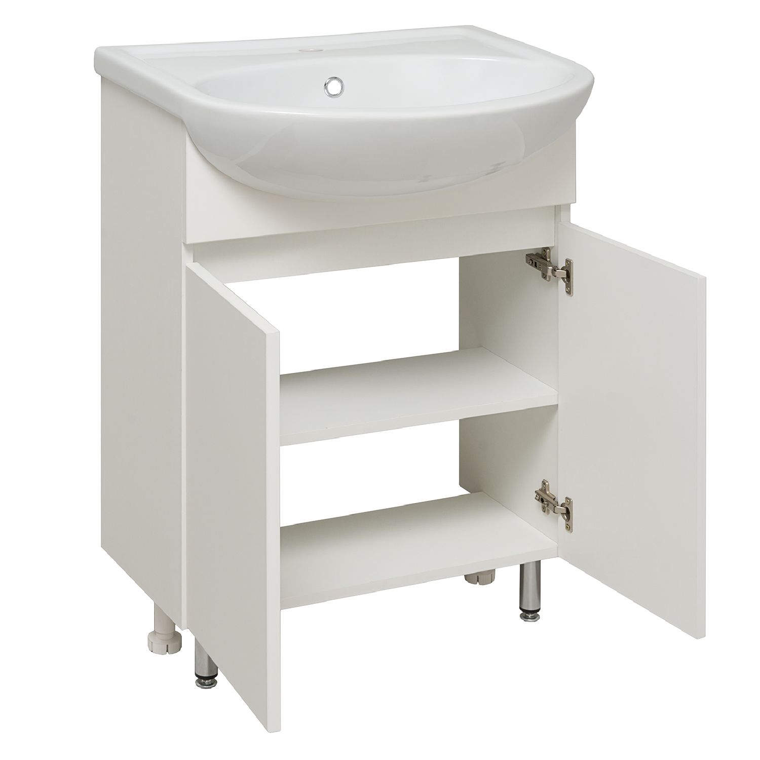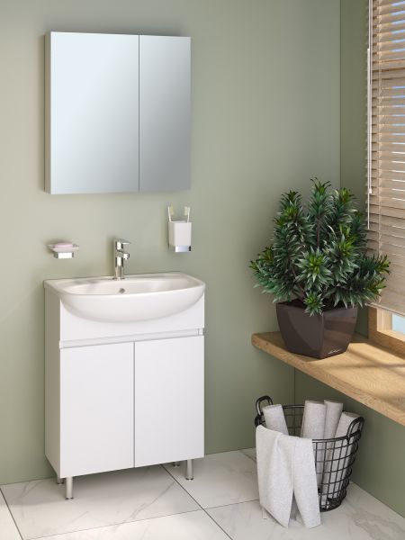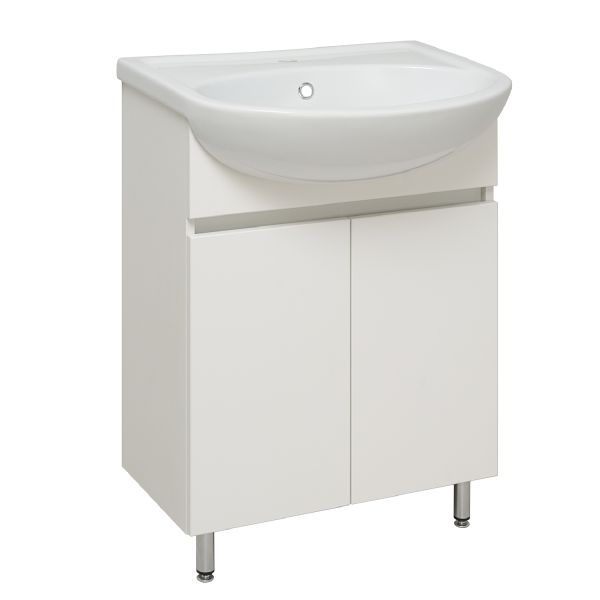 Тумба с раковиной RUNO ЛАДА - модное и оригинальное решение для бюджетного оснащения ванной комнаты. Тумба под раковину ЛАДА (напольная) выполнена в двух цветах - классическом белом и в стильном цвете - графит/серый дуб . Тумба в ванную имеет две распашные дверцы и одну внутреннюю полку. В комплекте идут петли со встроенным доводчиком, 2 хромированные и 2 пластиковые ножки. Тумба для ванной комплектуется керамической раковиной "Уют" (610*470 мм). Раковина имеет глубину 21 см. Раковина имеет глубину 18 см. Мебель для ванной RUNO - красота и практичность в мелочах!