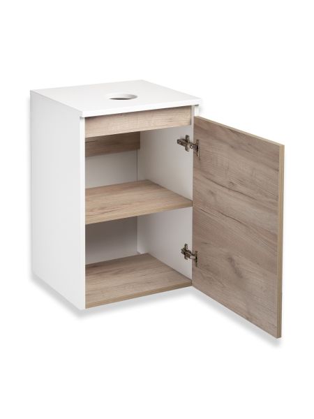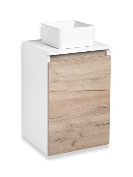 Тумба под раковину в ванную RUNO БАРИ (подвесная) - безупречное сочетание модных тенденций с классическим оформлением ванной комнаты. Тумба под раковину БАРИ оснащена распашной дверцей с правым открыванием. Цвет корпуса классический - белый, при этом цвет фасада в модном цвете – крафтовый дуб, идеально впишутся в любой интерьер ванной комнаты. К тумбе для ванной подойдут умывальники на столешницу: «UNO 24» (24х24см) – очень маленькая модель, идеально подходит для ограниченного пространства в небольших помещениях. Строгая квадратная геометрически правильная форма раковины, усиливает идею лаконичности в дизайне, устанавливается на столешницу, накладным методом. «DUE 38» (38х24см) – маленькая модель, идеально подходит для ограниченного пространства в небольших помещениях. Строгая прямоугольная геометрически правильная форма раковины с округлыми углами, усиливает идею лаконичности в дизайне, устанавливается на столешницу, накладным методом.