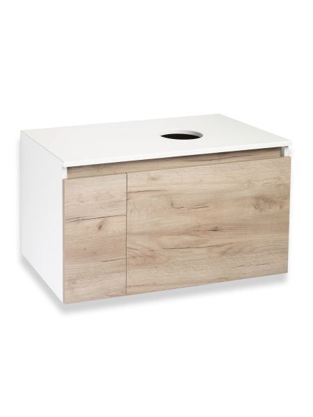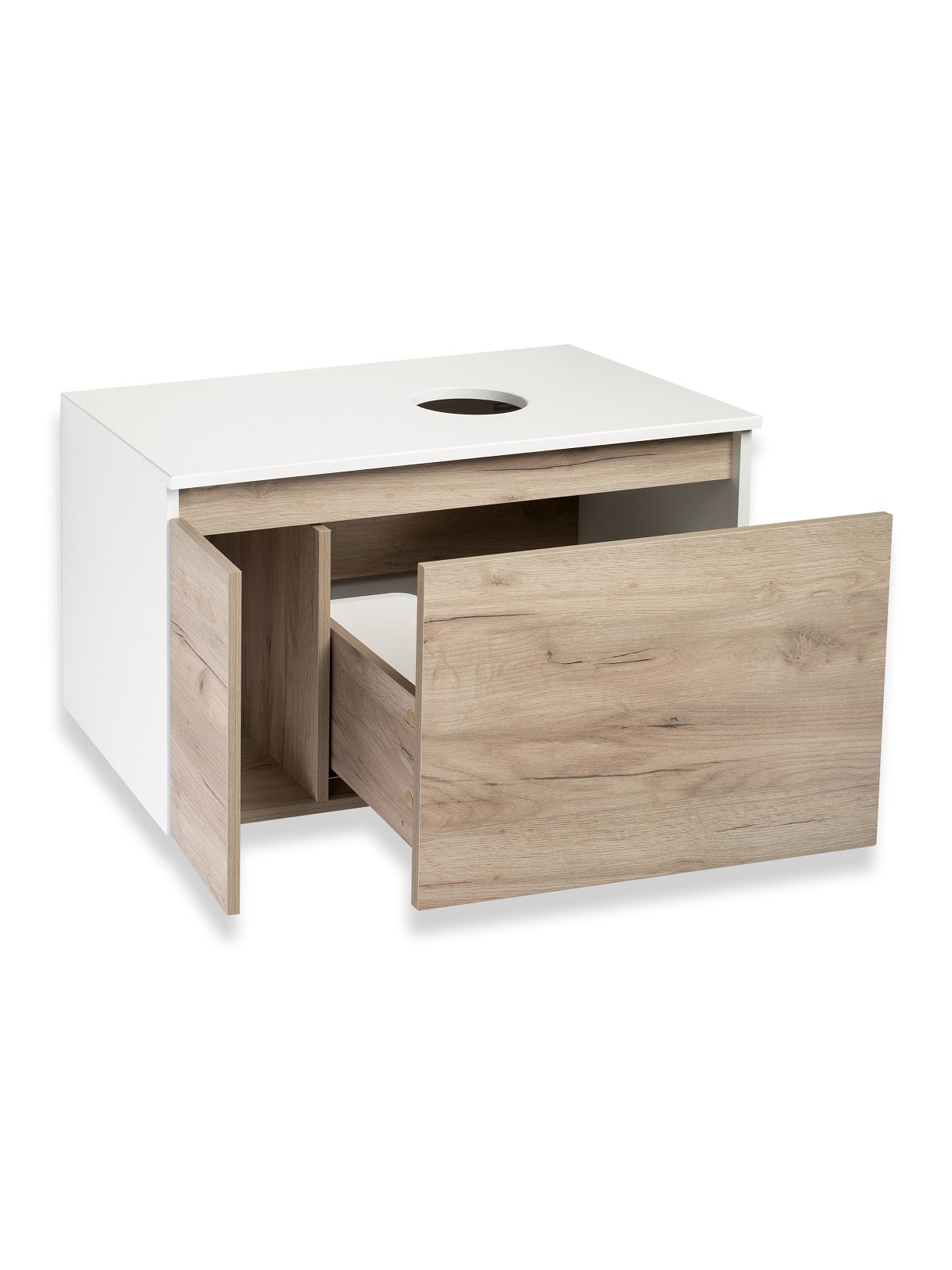 Тумба под раковину в ванную RUNO БАРИ (подвесная) - безупречное сочетание модных тенденций с классическим оформлением ванной комнаты. Тумба под раковину БАРИ оснащена выдвижным ящиком на шариковых направляющих, с системой плавного закрывания с правой стороны и распашной дверцей с левой стороны, дверца укомплектована двумя петлями верхняя с доводчиком, нижняя без доводчика. Цвет корпуса классический - белый, при этом цвет фасада в модном цвете – крафтовый дуб, идеально впишутся в любой интерьер ванной комнаты. К тумбе для ванной подойдут умывальники на столешницу: «OVALE 50» (50х36см) - идеальное решение для стильного интерьера ванной, создан для минималистичных интерьеров и подойдёт для санузлов в стиле лофт, минимализм и хай-тек. Строгая овальная геометрически правильная форма раковины, усиливает идею лаконичности в дизайне, устанавливается на столешницу, накладным методом. «PALLA D41» (диаметр 41см) - идеальное решение для стильного интерьера ванной, создан для минималистичных интерьеров и подойдёт для санузлов в стиле лофт, минимализм и хай-тек. Строгая круглая геометрически правильная форма раковины, усиливает идею лаконичности в дизайне, устанавливается на столешницу, накладным методом. «TRE 48» (48х37см) - идеальное решение для стильного интерьера ванной, создан для минималистичных интерьеров и подойдёт для санузлов в стиле лофт, минимализм и Хай-Тек. Строгая прямоугольная форма с округлыми углами усиливает идею лаконичности в дизайне, устанавливается на столешницу, накладным методом. «TERZO 60» (59х39см) - идеальное решение для стильного интерьера ванной, создан для минималистичных интерьеров и подойдёт для санузлов в стиле лофт, минимализм и хай-тек. Асимметричная раковина, которую можно установить любой стороной, дизайнерское решение для нестандартных интерьеров, усиливает идею лаконичности в дизайне, устанавливается на столешницу, накладным методом.