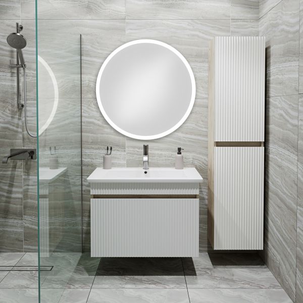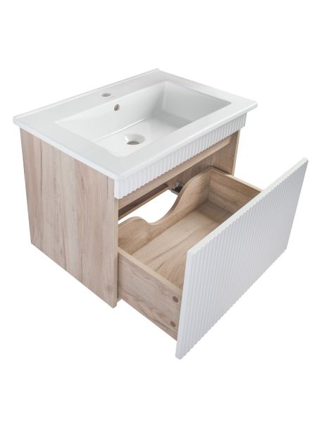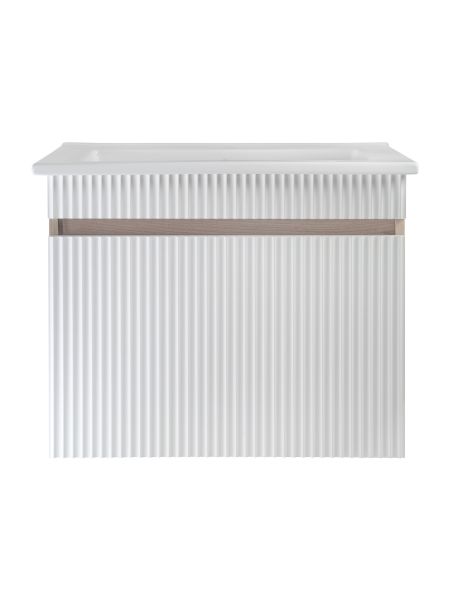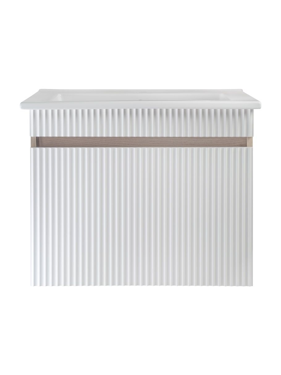 Тумба с раковиной RUNO МОДЕНА – это изысканность и утончённая роскошь в интерьере. Волнистые рифленые фасады визуально «оживляют» и «приводят в движение» всю обстановку комнаты, сохраняя при этом умиротворение и покой, превосходно сочетаются с древесной фактурой и текстурой необработанного натурального камня корпуса. В комплект мебели входят: тумба с раковиной. Тумба под раковину в ванную Модена оснащена выдвижным ящиком на шариковых направляющих. Цвет корпуса в двух цветах: текстура светлого дерева или необработанного натурального камня. Цвет фасада классический – белый глянец, идеально впишутся в любой интерьер ванной комнаты. Тумба для ванной комплектуется накладной керамической раковиной «Оскар» (770х470 мм). Раковина глубиной 19 см. Мебель для ванной RUNO - красота и практичность в мелочах, комплект мебели Модена – лучший выбор для Вашей ванной комнаты!