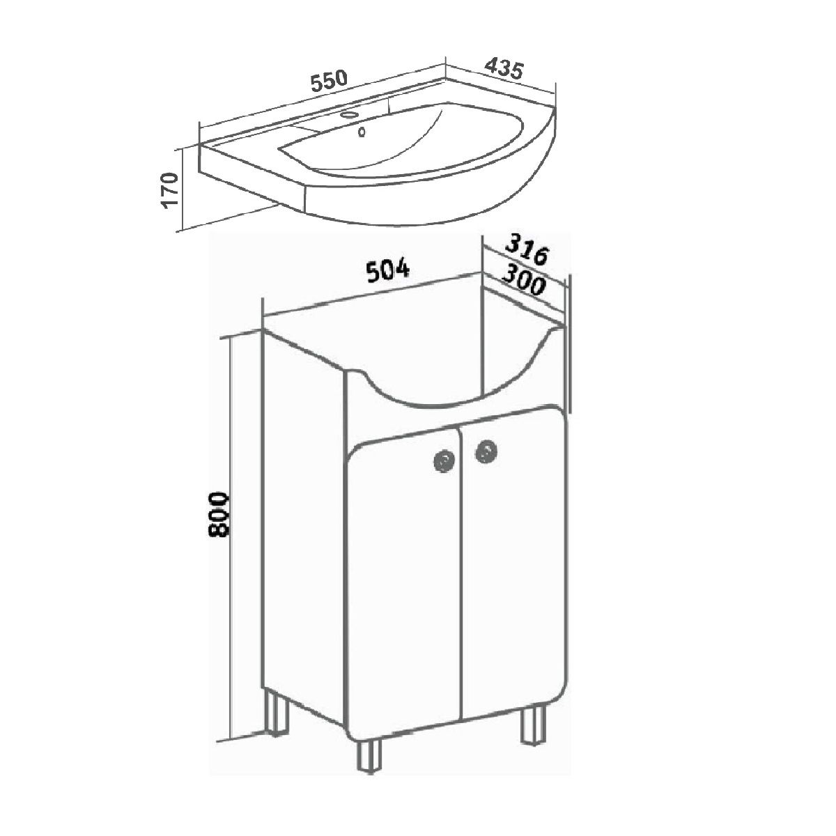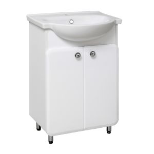 Тумба под умывальник напольная с двумя распашными дверками и одной внутренней полкой. Петли со встроенным доводчиком, ручки - 2шт, ножки хром - 2шт, ножки пластик -2шт.