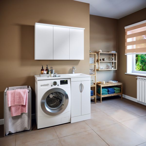 Тумба "Лира" 45 см напольная с двумя распашными дверками и одной встроенной полкой. Устанавливается на 4-е пластиковые опоры, скрытые за нижней съемной фальшь-панелью. Комплектуется умывальником из литьевого мрамора "Gamma 105 лайт" Умывальник устанавливается на тумбу и кронштейн. Модель предусматривает установку стиральной машины под крылом умывальника