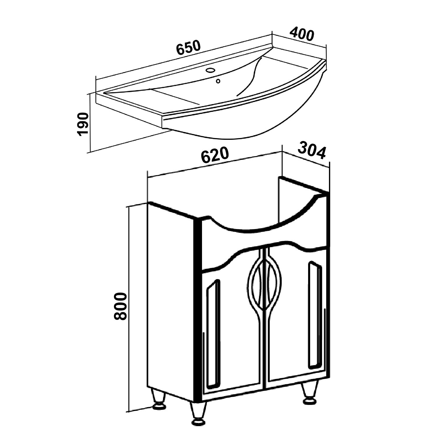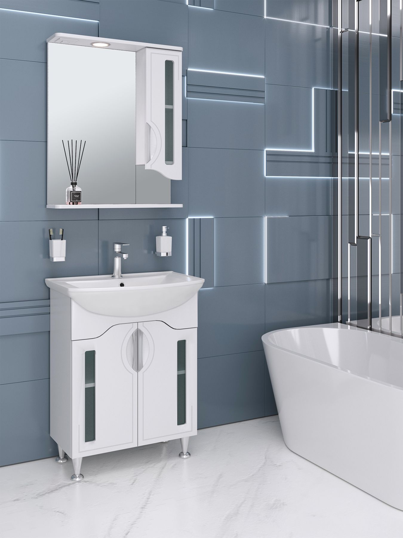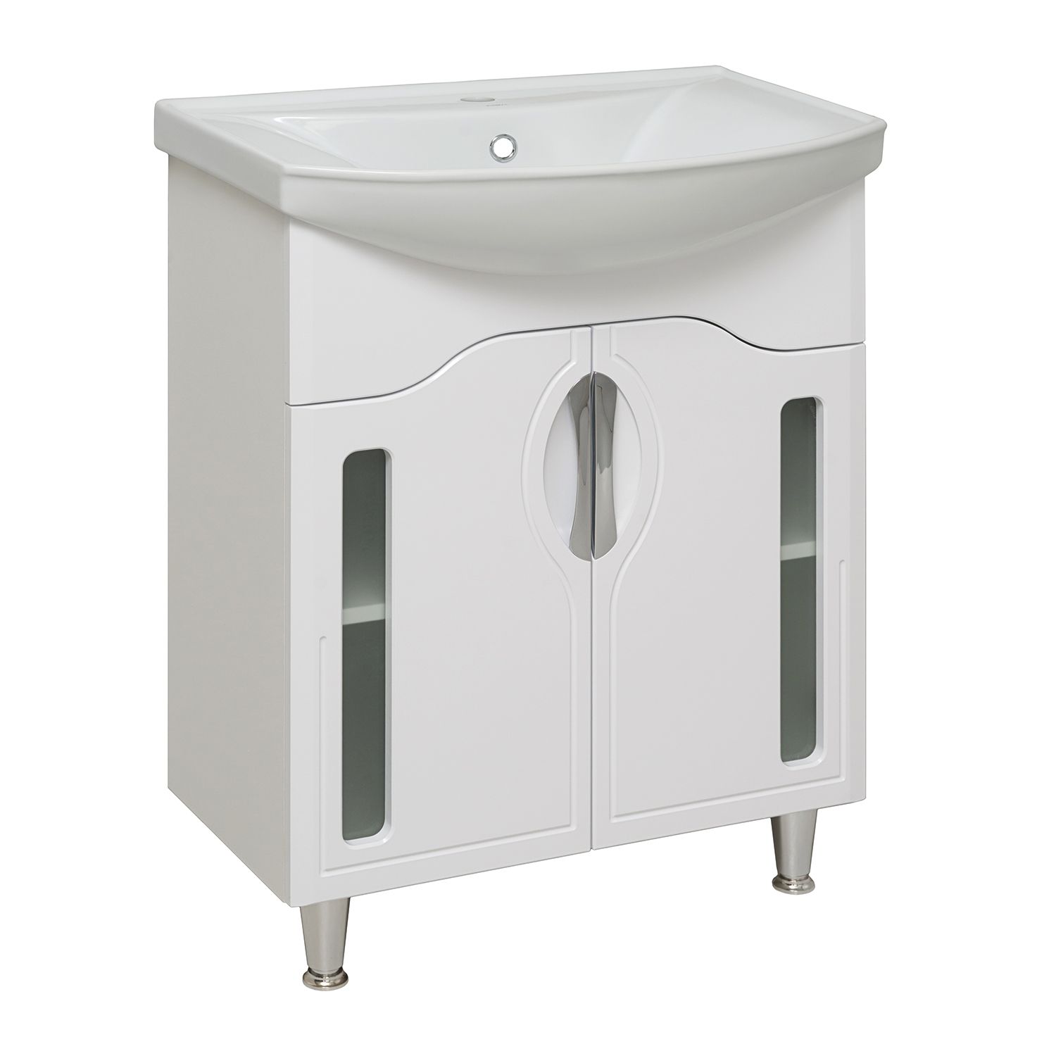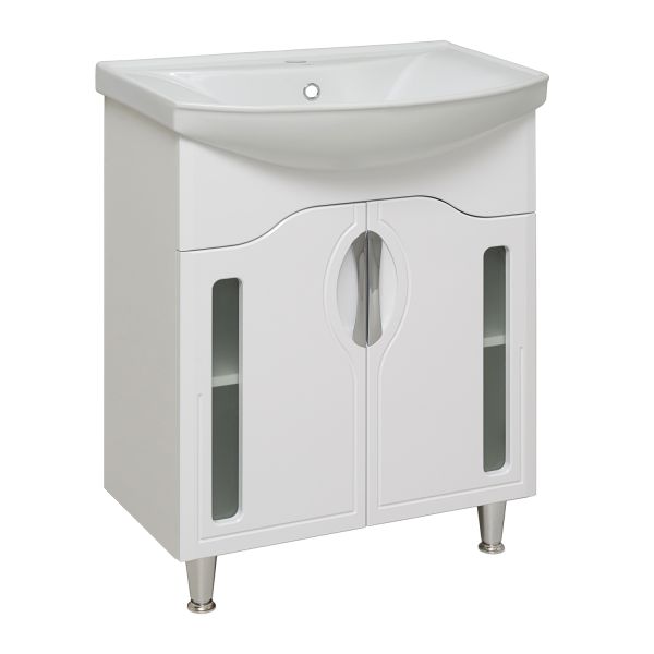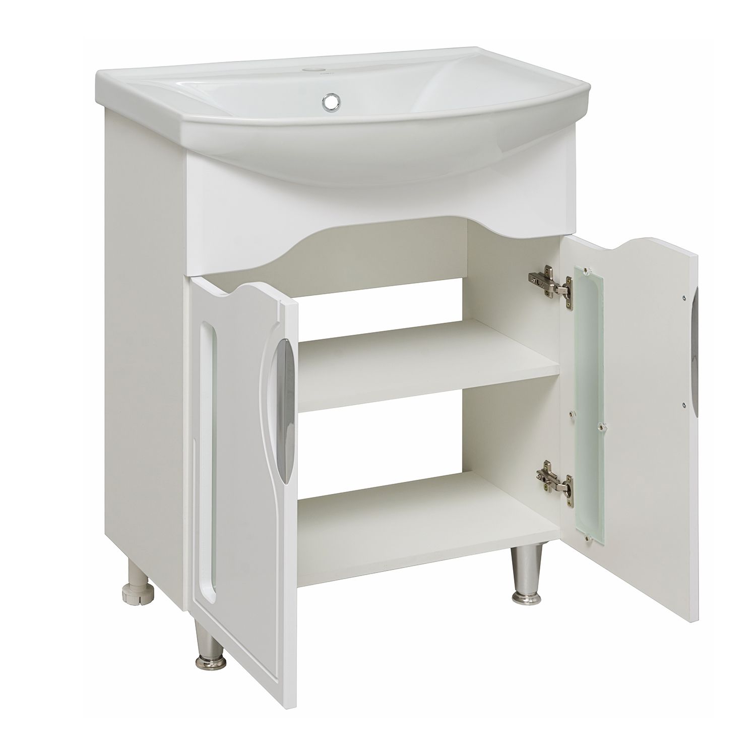 Тумба под умывальник напольная с двумя распашными фасадами со стеклянной вставкой и одной внутренней полкой. Петли со встроенным доводчиком, ручки врезные- 2шт, ножки хром - 2шт, ножки пластик -2шт.