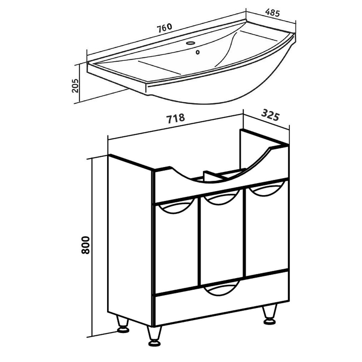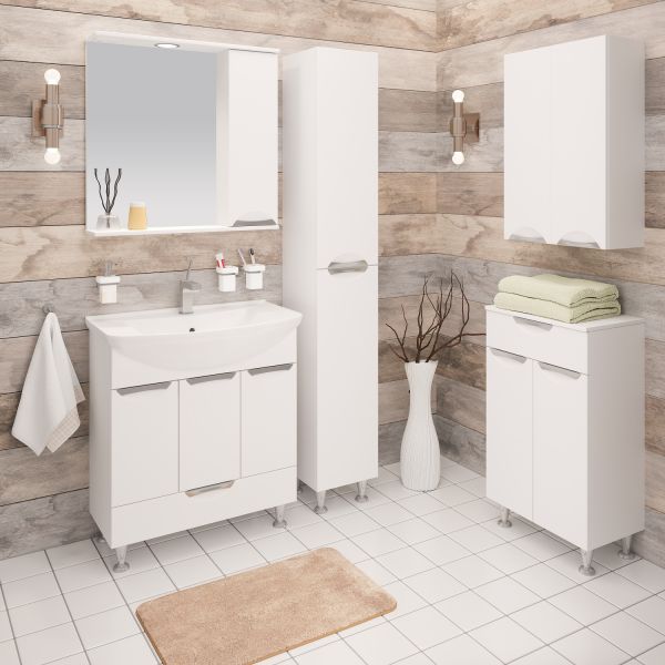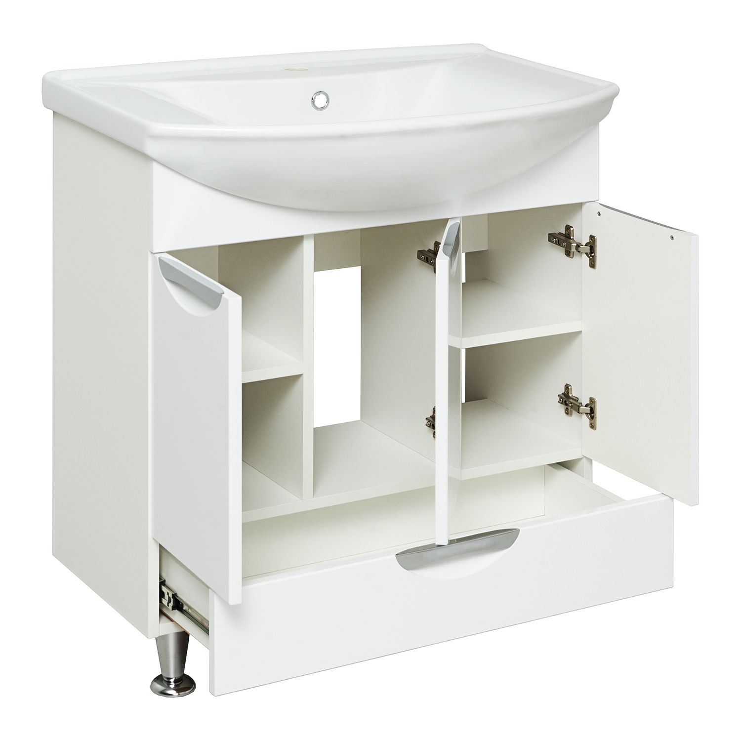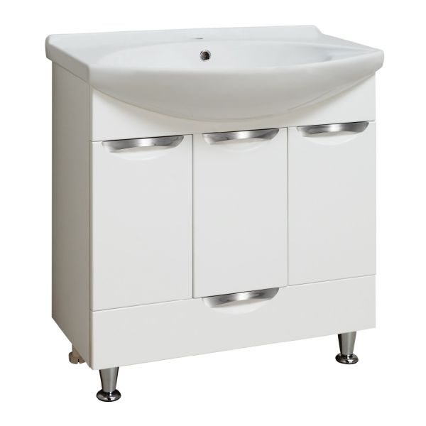 Тумба под умывальник напольная с тремя распашными фасадами и нижним выдвижным ящиком. За фасадами - одна встроенная полка. Петли со встроенным доводчиком, ящик - на шариковых направляющих полного выдвижения, ручки врезные - 4шт, ножки хром - 2шт, ножки пластик -2шт.