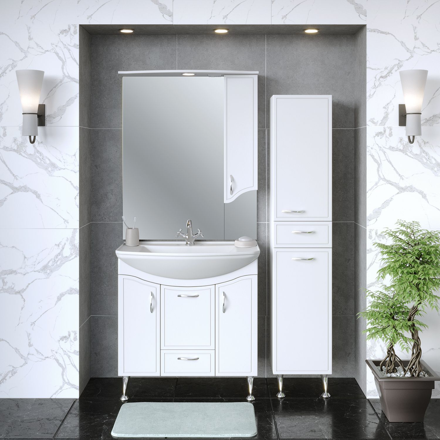 Тумба под умывальник напольная с двумя распашными фасадами, откидной дверкой посередине и нижним выдвижным ящиком. За каждой дверкой -по одной внутренней полке. Петли со встроенным доводчиком, ящик - на шариковых направляющих полного выдвижения, ручки - 4шт, ножки хром -2шт, ножки пластик - 2шт.