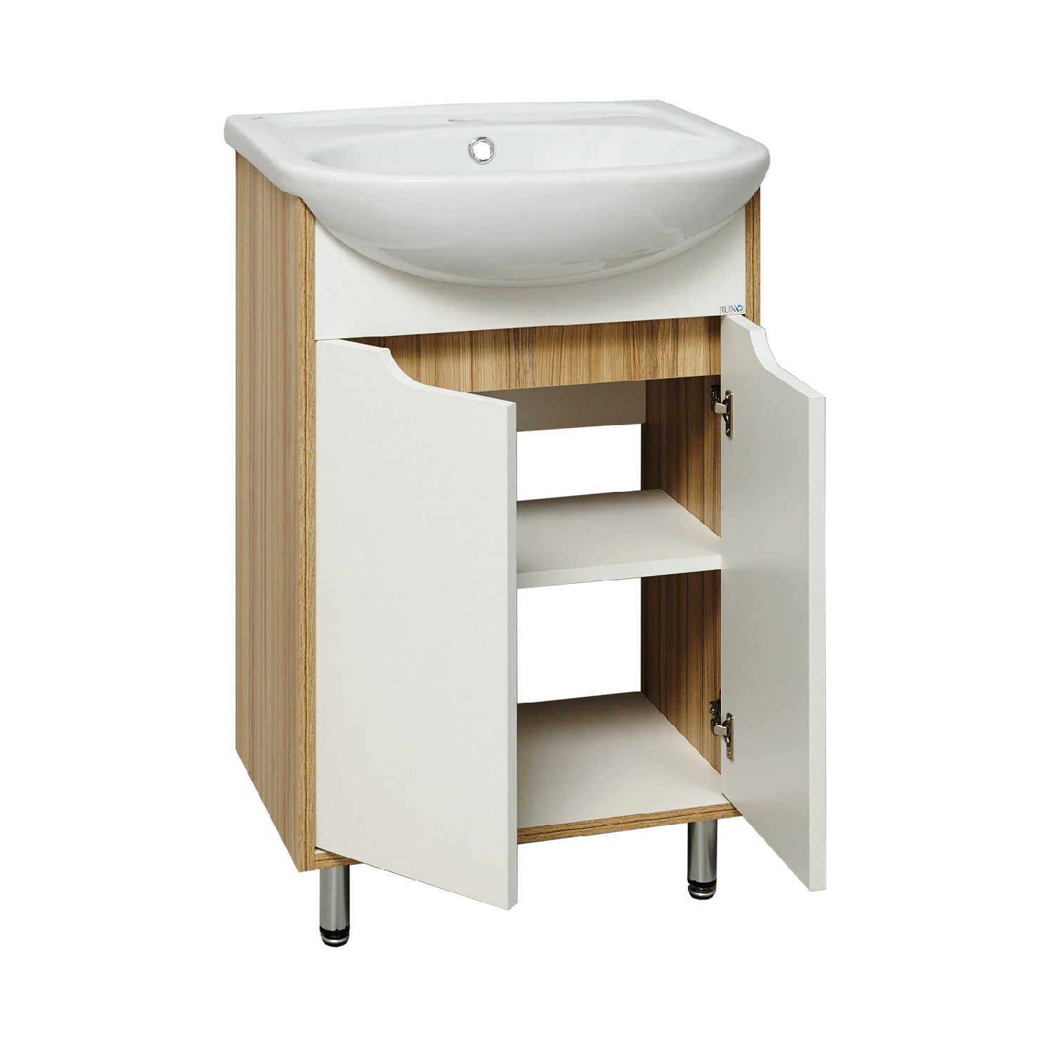 Тумба под умывальник напольная с двумя распашными фасадами и одной внутренней полкой. Ножки хром - 2шт, ножки пластик -2шт.