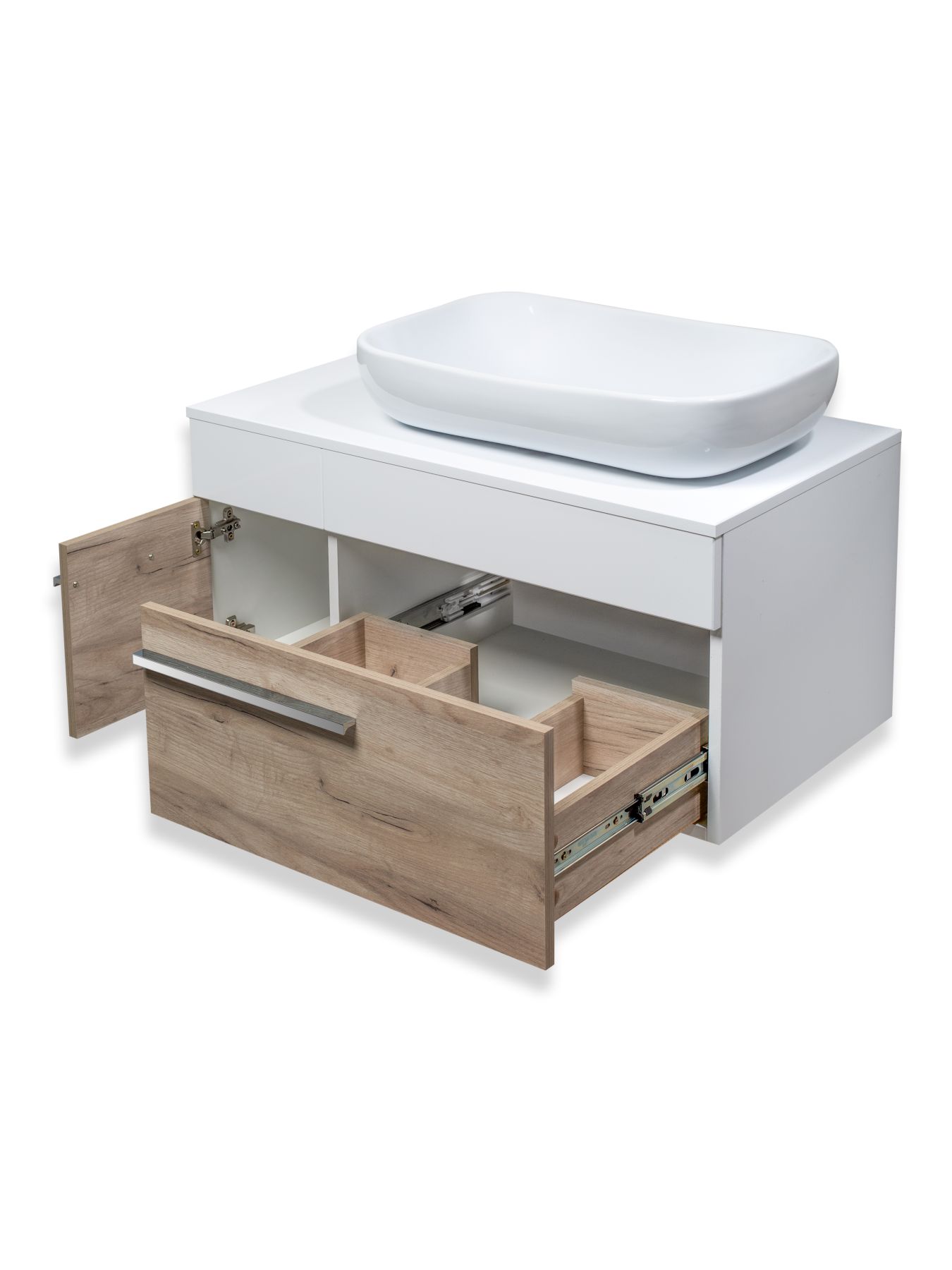 Тумба под раковину в ванную RUNO ВУДЛАЙН (подвесная) - выполнена в ультрасовременном дизайне в цвете крафтовый дуб. Тумба в ванную оснащена выдвижным ящиком на шариковых направляющих, и одной распашной дверцей. Тумба под раковину ВУДЛАЙН гармонично впишется в любой интерьер ванной комнаты. В комплект входят: 2 ручки, петли со встроенным доводчиком, навесы для крепления к стене. К тумбе для ванной комнаты подходят накладные керамические раковины: Infinity 60 с чашей прямоугольной формы (600х370 мм), глубиной 12 см; Moduo 50 SQUARE с чашей прямоугольной формы (500х360 мм), глубиной 15 см; Moduo 55 LEAF - асимметричная раковина, которую можно установить любой стороной, дизайнерское решение для нестандартных интерьеров (565х365 мм), глубиной 15 см; Гамма 56 - c глубокой чашей и высокими бортиками, которые отражают современные тренды в дизайне. (560х370 мм), глубиной 18 см. Мебель для ванной RUNO - красота и практичность в мелочах!