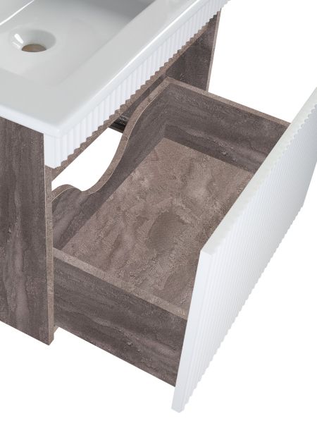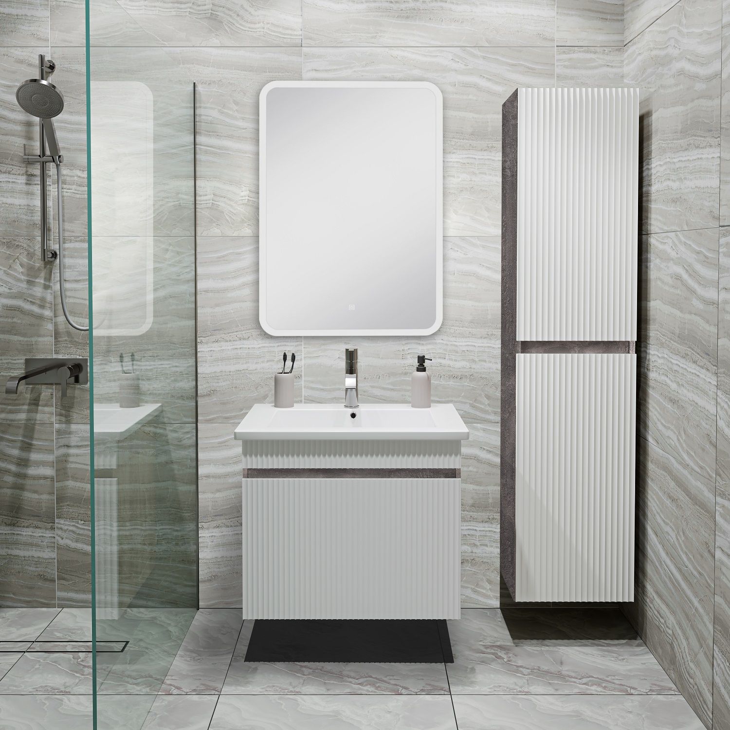 Тумба с раковиной RUNO МОДЕНА – это изысканность и утончённая роскошь в интерьере. Волнистые рифленые фасады визуально «оживляют» и «приводят в движение» всю обстановку комнаты, сохраняя при этом умиротворение и покой, превосходно сочетаются с древесной фактурой и текстурой необработанного натурального камня корпуса. В комплект мебели входят: тумба с раковиной. Тумба под раковину в ванную Модена оснащена выдвижным ящиком на шариковых направляющих. Цвет корпуса в двух цветах: текстура светлого дерева или необработанного натурального камня. Цвет фасада классический – белый глянец, идеально впишутся в любой интерьер ванной комнаты. Тумба для ванной комплектуется накладной керамической раковиной «Оскар» (660х470 мм). Раковина глубиной 19 см. Зеркало с подсветкой для ванной Руан (60х80) - стильное, современное и практичное решение для оформления интерьера ванной комнаты. Мягкая светодиодная подсветка по периметру зеркала для ванной создаст домашние уют и тепло, а также привнесет изысканность в классический или ультрасовременный интерьер. Мебель для ванной RUNO - красота и практичность в мелочах, комплект мебели Модена – лучший выбор для Вашей ванной комнаты!