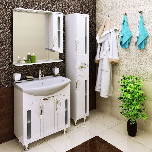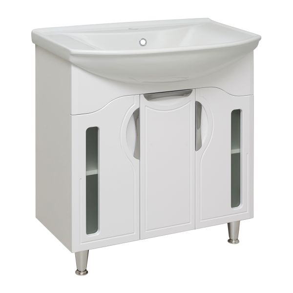 Тумба под умывальник напольная с тремя распашными фасадами со стеклянной вставкой и одной внутренней полкой. Петли со встроенным доводчиком, ручки врезные- 3шт, ножки хром - 2шт, ножки пластик -2шт.