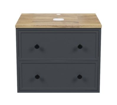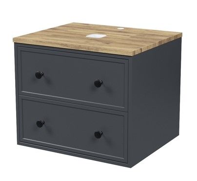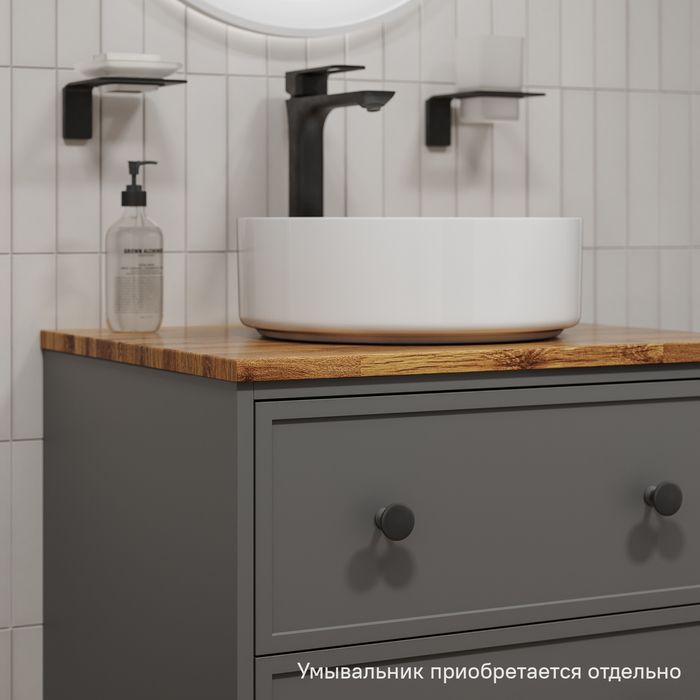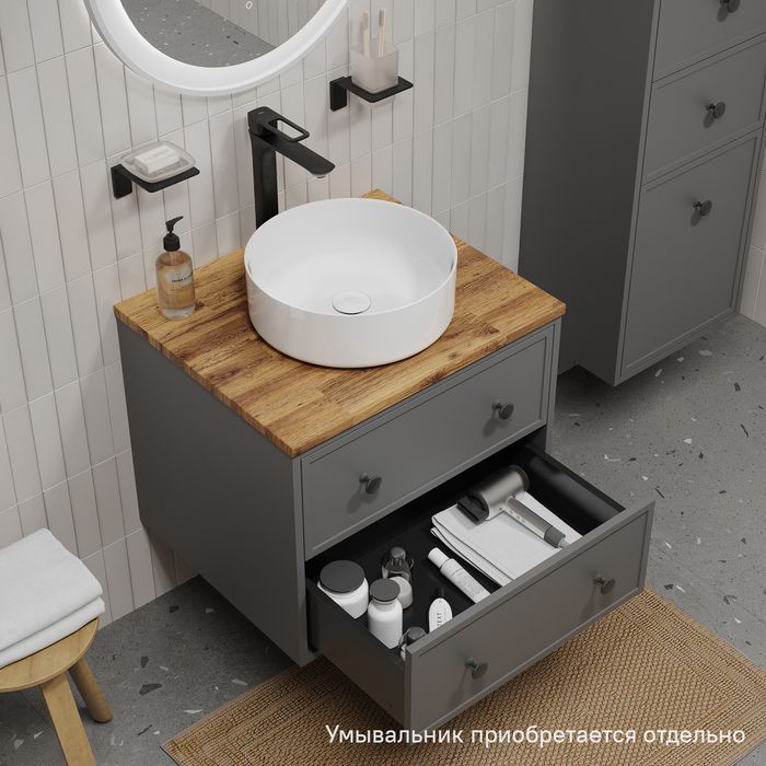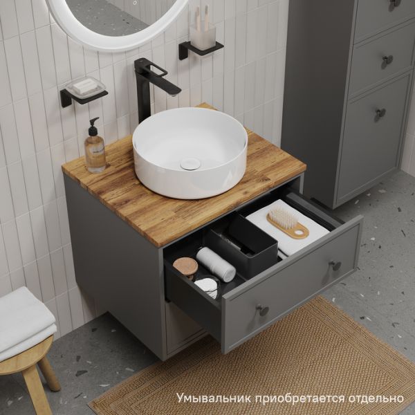 Компактная подвесная тумба Torr трендового темно-серого цвета со столешницей из клееного натурального дуба. Сочетает в себе узнаваемый стиль и практичность популярного скандинавского дизайна. Ее четкие формы, теплый цвет дерева, фасады с декоративной филенкой, круглые ручки смотрятся гармонично и впишутся в любой современный интерьер. Подойдет любой накладной умывальник, покупается отдельно.