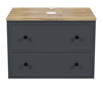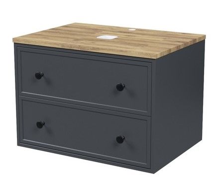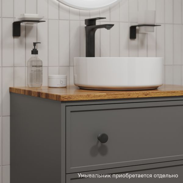 Компактная подвесная тумба Torr трендового темно-серого цвета со столешницей из клееного натурального дуба. Сочетает в себе узнаваемый стиль и практичность популярного скандинавского дизайна. Ее четкие формы, теплый цвет дерева, фасады с декоративной филенкой, круглые ручки смотрятся гармонично и впишутся в любой современный интерьер. Подойдет любой накладной умывальник, покупается отдельно.