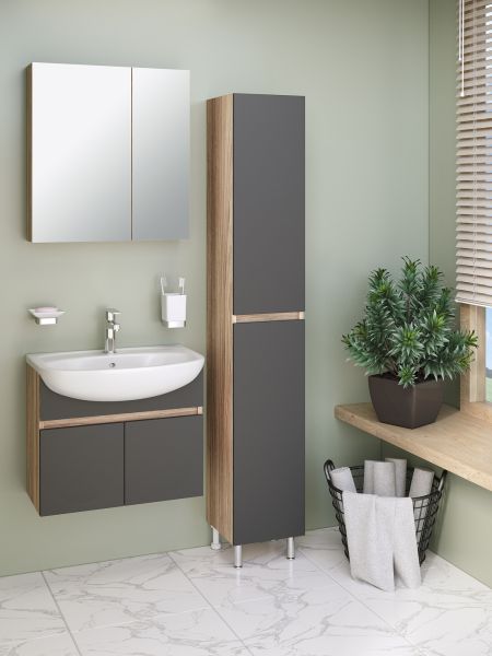 Тумба под раковину для ванной RUNO ЛАДА - модное и оригинальное решение для бюджетного оснащения ванной комнаты. Коллекция мебели ЛАДА выполнена в трёх цветах - классическом белом, в стильных и модных цветах - графит и крафтовый дуб . Тумба под раковину оснащена двумя распашными дверцами, каждая дверца укомплектована двумя петлями, верхняя с доводчиком, нижняя без доводчика. К тумбе подходит керамическая раковина "Уют" (610*470 мм). Раковина глубиной 21 см. Мебель для ванной RUNO - красота и практичность в мелочах!