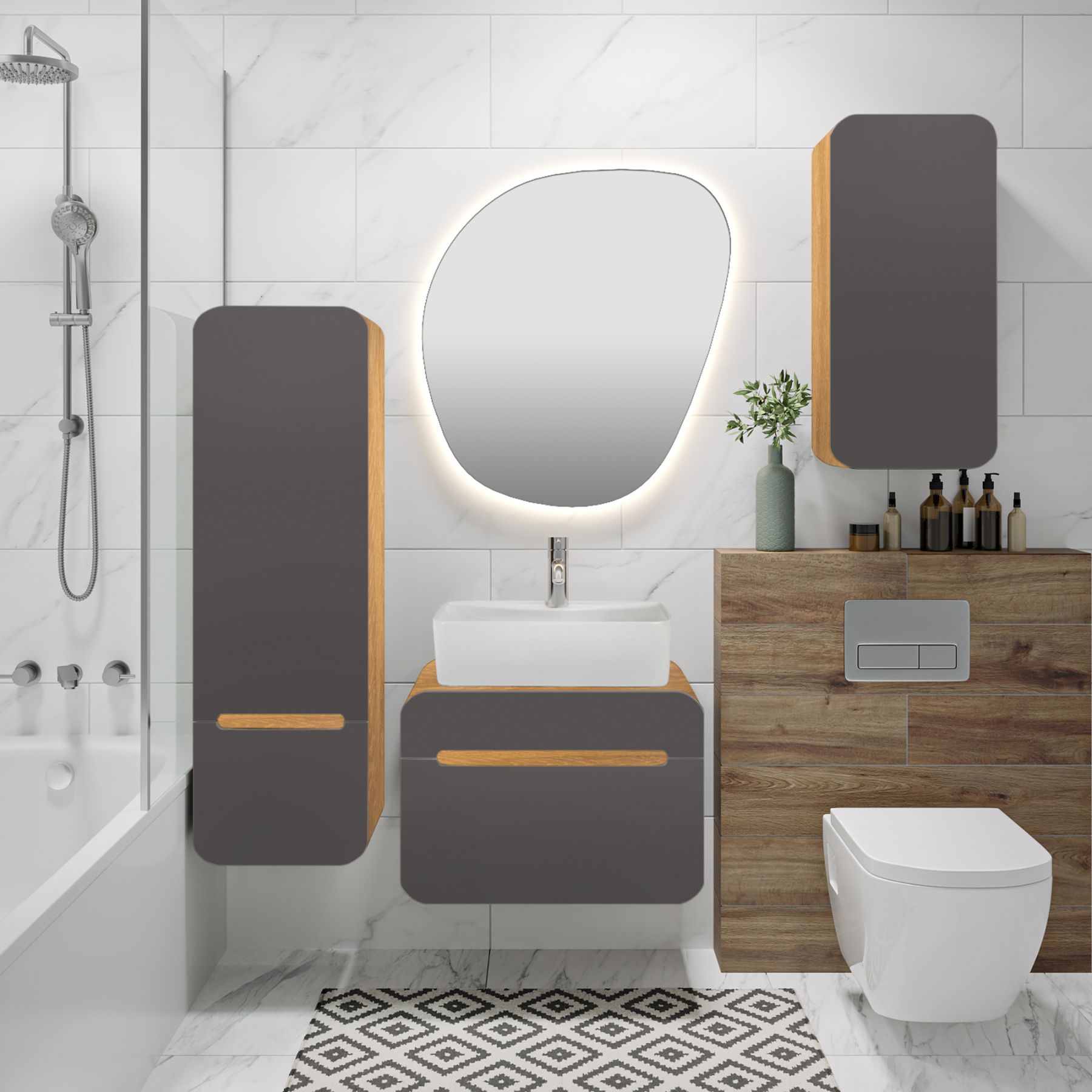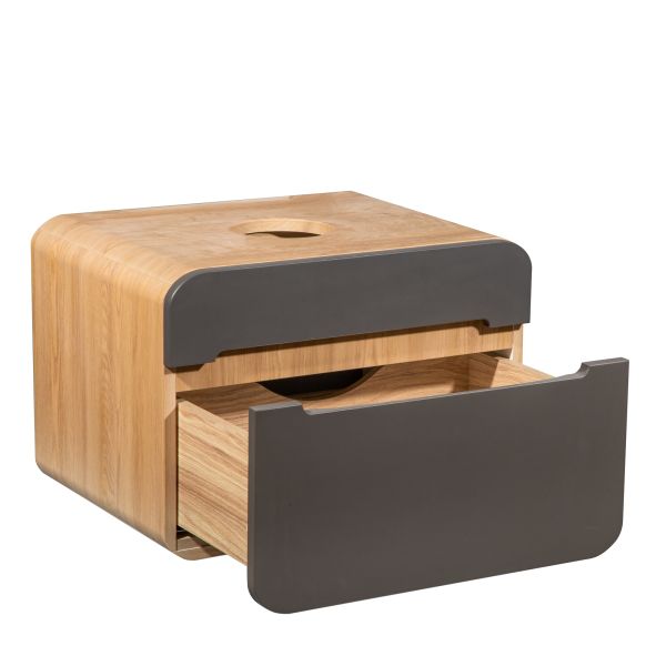 Тумба под раковину RUNO НИЦЦА - сочетание безупречного стиля и современных тенденций в дизайнерском оформлении ванной комнаты. Тумба Ницца (подвесная) с обтекаемыми формами станет прекрасным дополнением в интерьере Вашей ванной комнаты, выполнена в сочетании корпуса с текстурой светлого натурального дерева с фасадами цвета графит. Плавные линии в сочетании с фактурным покрытием сделают обстановку вашей ванной максимально теплой и уютной. Придадут изысканность и завершенность домашней обстановке. Тумба оснащена одним выдвижным ящиком с бесшумными шариковыми направляющими полного выдвижения, навесами для крепления к стене. Функцию ручки выполняет декоративный вырез. Фасады тумбочки изготовлены из МДФ. К тумбе для ванной подходят накладные раковины: круглая - PALLA D41, прямоугольная - TRE 48, овальная - OVALE 50, треугольная - TERZO 60, и множество других раковин разнообразных размеров и цветов . Наполните свой дом качественными предметами интерьера. Мебель для ванной RUNO - красота и практичность в мелочах! Цвет товара на мониторе может отличаться от реальных цветов, это зависит от настроек цветового профиля и разрешения Вашего монитора или мобильного устройства.
