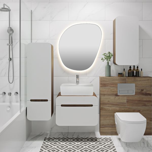 Тумба под раковину RUNO НИЦЦА - сочетание безупречного стиля и современных тенденций в дизайнерском оформлении ванной комнаты. Тумба Ницца (подвесная) с обтекаемыми формами станет прекрасным дополнением в интерьере Вашей ванной комнаты, выполнена в сочетании корпуса с текстурой темного дерева с белыми фасадами. Плавные линии в сочетании с фактурным покрытием сделают обстановку вашей ванной максимально теплой и уютной. Придадут изысканность и завершенность домашней обстановке. Тумба оснащена одним выдвижным ящиком с бесшумными шариковыми направляющими полного выдвижения, навесами для крепления к стене. Функцию ручки выполняет декоративный вырез. Фасады тумбочки изготовлены из МДФ. К тумбе для ванной подходят накладные раковины: круглая - PALLA D41, прямоугольная - TRE 48, овальная - OVALE 50, треугольная - TERZO 60, и множество других раковин разнообразных размеров и цветов . Наполните свой дом качественными предметами интерьера. Мебель для ванной RUNO - красота и практичность в мелочах! Цвет товара на мониторе может отличаться от реальных цветов, это зависит от настроек цветового профиля и разрешения Вашего монитора или мобильного устройства.