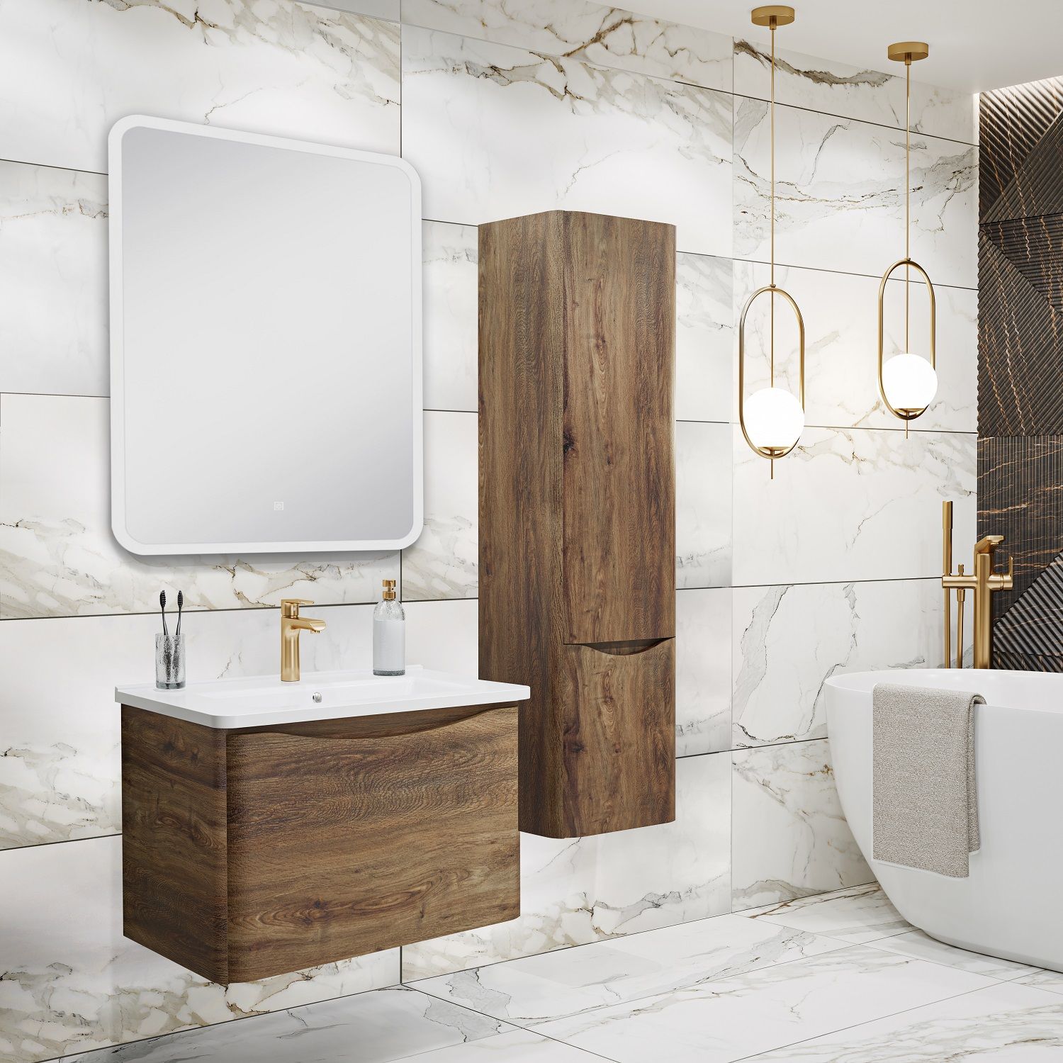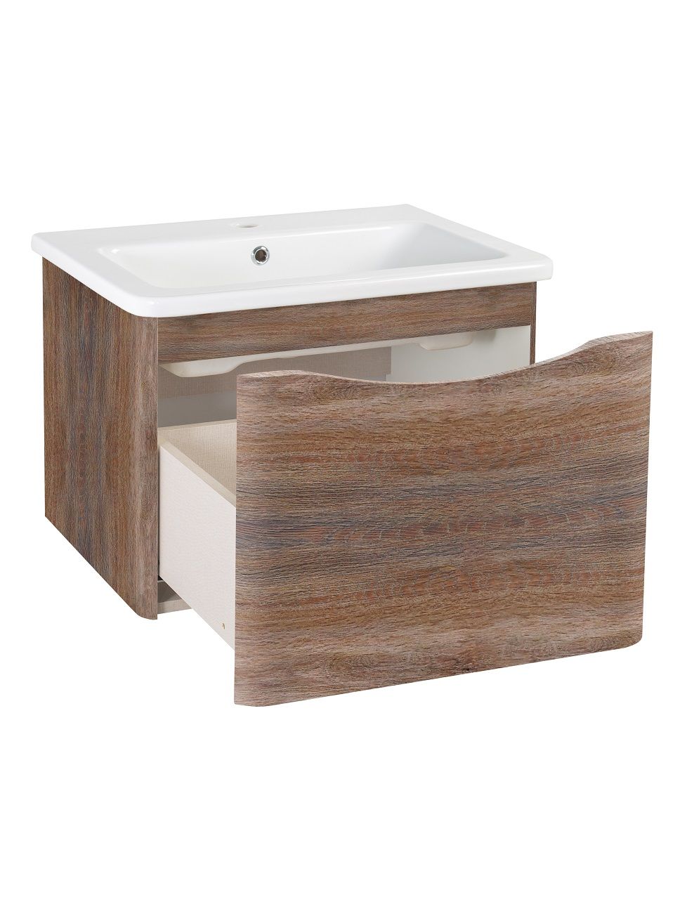Тумба с раковиной в ванную Runo Тоскана (подвесная) - выполнена в ультрасовременном дизайне в цвете темное дерево. Тумба под раковину отличается изысканным дизайном, скруглённые углы тумбы, древесная текстура фасада, врезная ручка – придают мебели необычный и незабываемый внешний вид. Тумба в ванную оснащена выдвижным ящиком на шариковых направляющих, с системой плавного закрывания. Тумба под раковину ТОСКАНА гармонично впишется в любой интерьер ванной комнаты. Тумба для ванной комплектуется накладным керамическим умывальником Никсон 60 (600х460 мм) ТМ Dreja, необычный дизайн которого сочетание строгих линий прямоугольника со скруглёнными углами, отражают современные тренды в дизайне. Раковина глубиной 16 см. Мебель для ванной комнаты RUNO - красота и практичность в мелочах!