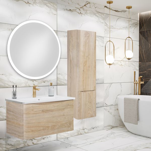 Тумба с раковиной в ванную Runo Тоскана (подвесная) - выполнена в ультрасовременном дизайне в цвете светлое дерево. Тумба под раковину отличается изысканным дизайном, скруглённые углы тумбы, древесная текстура фасада, врезная ручка – придают мебели необычный и незабываемый внешний вид. Тумба в ванную оснащена выдвижным ящиком на шариковых направляющих, с системой плавного закрывания. Тумба под раковину ТОСКАНА гармонично впишется в любой интерьер ванной комнаты. Тумба для ванной комплектуется накладным керамическим умывальником Никсон 80 (800х460 мм) ТМ Dreja, необычный дизайн которого сочетание строгих линий прямоугольника со скруглёнными углами, отражают современные тренды в дизайне. Раковина глубиной 16 см. Мебель для ванной комнаты RUNO - красота и практичность в мелочах!