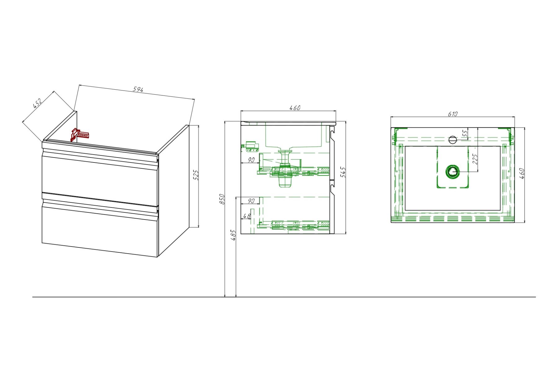 Габариты (Д В Ш), мм: 610*545*46Материал корпуса тумбы: ЛДСП 16мм Эггер с последующей покраской в 5 слоевМатериал фасада тумбы: ЛМДФ 22мм Эггер с последующей покраской в 5 слоевМонтаж: подвеснойМатериал раковины: 100% санфарфорДва выдвижных ящикаНаправляющие с доводчиком GTV, плавное скольжение и мягкое закрываниеНавесы усиленные (100кг/пара)Мебель поставляется в собранном видеДля сифона диаметром 1 1/4 x 32 ммГарантия: на мебель 2 года, на раковину 10 лет