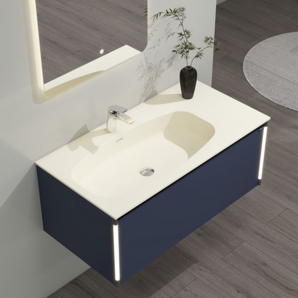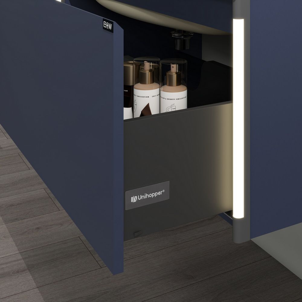 Тумба с раковиной для ванной комнаты датского производителя Black&White в габаритных размерах 100x52x36 см.Раковина – столешница асимметричной конфигурации с широкой чашей и расширенным местом для хранения ванных принадлежностей выполнена из не пористого искусственного камня Corian и оснащена донным клапаном хромированного цвета.Тумба производится из девятислойной фанеры и окрашена влагостойкой эмалью глубокого синего цвета.Зона хранения оснащена одним выдвижным ящиком с высоким фасадом, механизм открывания – UniHopper с доводчиками.Важной особенностью является контурная диодная подсветка, которая расположена справа и слева от фасада, установленная на торцы корпуса.Она включается автоматически при приближении человека с расстояния 3-х метров и гаснет спустя 30 секунд после того, как Вы покинули помещение. U 945 – продукт разработанный датскими дизайнерами, в котором собраны все тенденции актуального мебелестроения для комфортного использования зоны умывания, а также наполнения ванной комнаты комфортом и уютом.