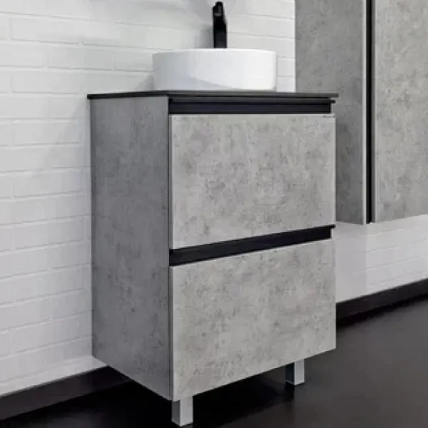 Тумба с раковиной Comforty Эдинбург 00-00004767 60 см Бетон светлыйХарактеристики: Тумба: Цвет: бетон светлый. Габариты вместе с раковиной (ШхВхГ): 60x95x40 см. Материал фасада и корпуса: ВЛДСП. Система хранения: выдвижные ящики. Оснащение: механизм доводчика, обеспечивающий плавное закрывание. Монтаж: полуподвесной. Тумба подготовлена для подключения водоснабжения снизу. Раковина-чаша: Материал: санфарфор. Цвет: белый. В комплекте поставки: тумба, раковина-чаша Comforty 9111, 2 ножки, 2 черные матовые профильные ручки, столешница из черного керамогранита, крепления