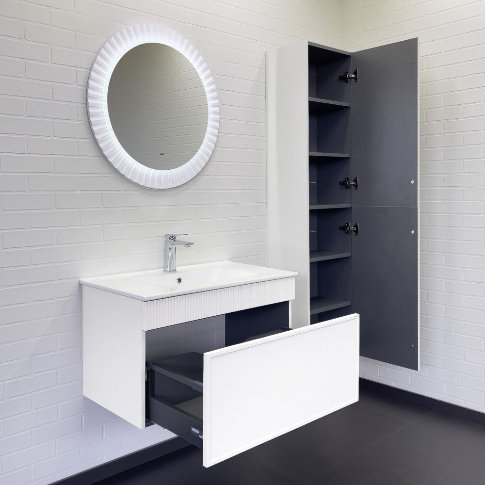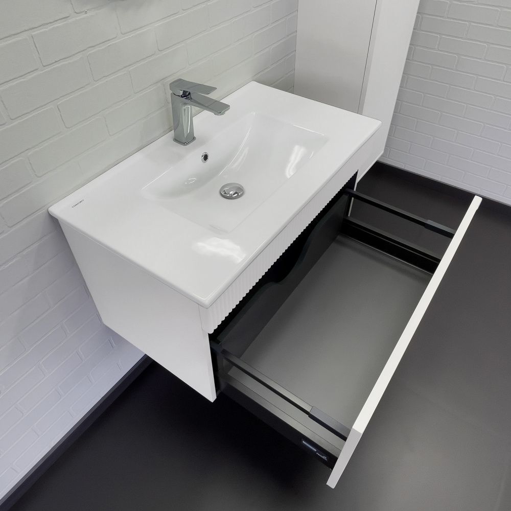 Комплектация: керамическая раковина Comforty 80EПодвесная тумба с одним большим выкатным ящиком оборудованным направляющими с системой плавного закрывания. Корпус тумбы изготовлены из влагостойкого ЛДСП. Фасад тумбы из МДФ фрезерован кантом по периметру. Подпорная царга фрезерована вертикальным узором. Корпус и фасад тумбы окрашены белой матовой эмалью. Тумба подготовлена для подключения водоснабжения снизу и сзади.