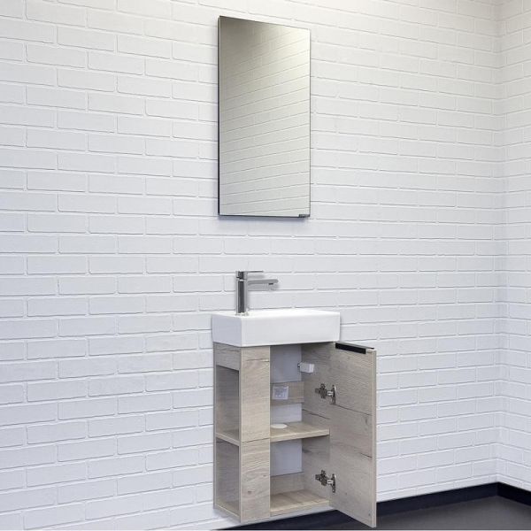 Тумба с раковиной Comforty Матэ 00-00015132 41.5 см Дуб дымчатыйКомпактная подвесная тумба-умывальник Comforty Матэ для небольших санузлов. Фасад и корпус тумбы изготовлены из влагостойкого ДСП в декоре дуб дымчатый. Этот декор при прикосновении дарит ощущение натуральной древесины. В комплекте асимметричная раковина с отверстием под смеситель сбоку. Раковина глазурована со всех сторон, поэтому может быть установлена как в правом, так и в левом варианте. На левом торце тумбы - полки.Характеристики:Тумба:Цвет: дуб дымчатый.