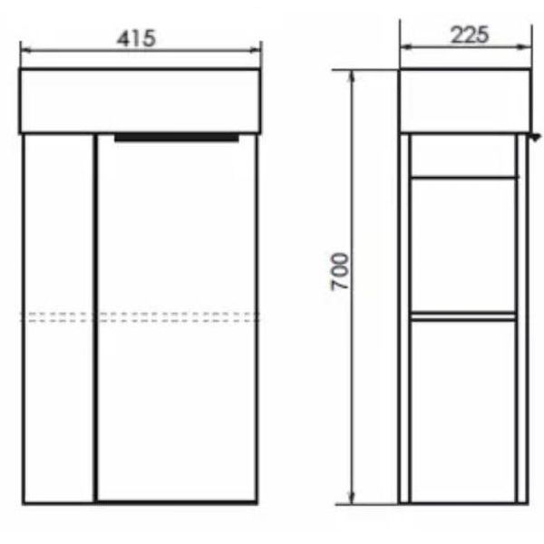 Габариты тумбы с раковиной (ШхВхД): 415х700х225 мм.