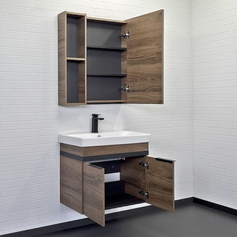 Тумба с раковиной Comforty Соло 00-00010978 70 см Дуб темно-коричневыйПодвесная тумба в современном стиле с двумя створками оснащенными системой плавного закрывания. Для сохранения геометрических размеров конструкция тумбы усилена металлической рамой окрашенной в цвет черный муар.