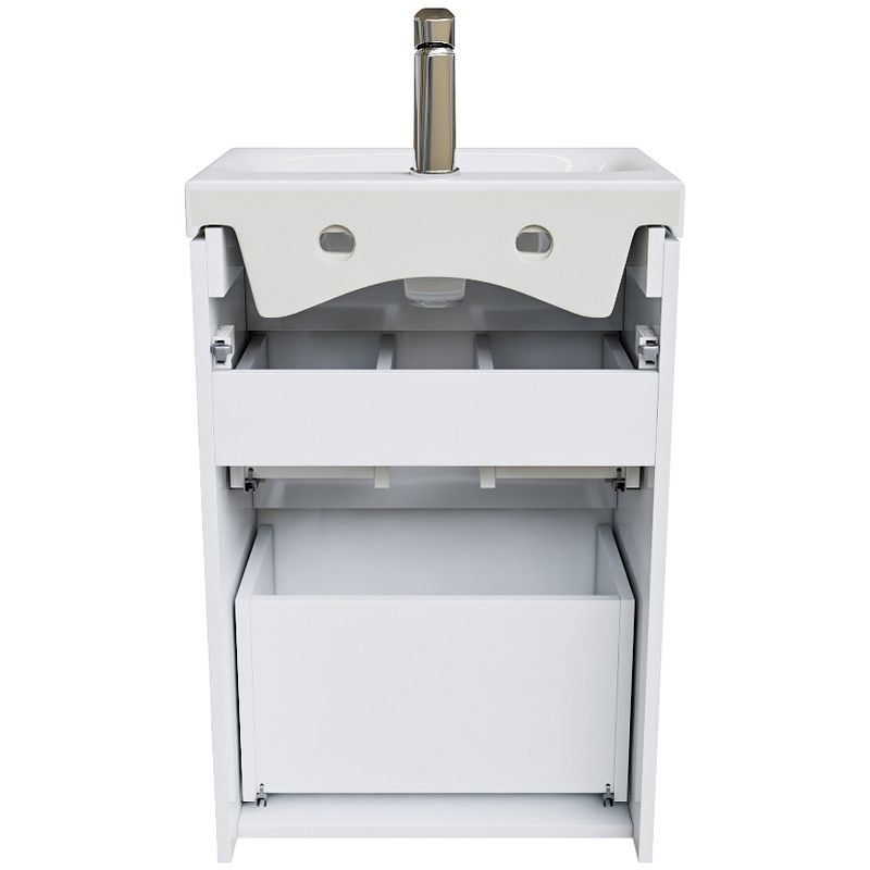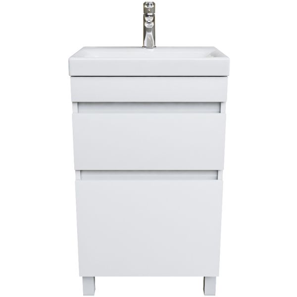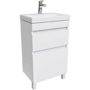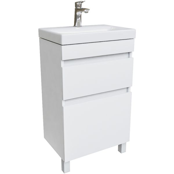 Компактная напольная тумба для ванной комнаты Zodiac с умывальником и ящиками – высокий уровень удобства и практичности в сочетании с лаконичным универсальным дизайном. Фасад и боковины изготовлены из ЛДСП, покрыты несколькими слоями белоснежной эмали. Керамический умывальник с высоким бортом и большой вместительной чашей в комплекте. Удобен для гигиенических и хозяйственных нужд. Два вместительных выдвижных ящика с механизмом плавного доведения закрываются плавно и бесшумно. Интегрированные ручки. Фурнитура рассчитана на 30 000 открываний, что составляет более 10 лет исправной работы. В комплекте также белые пластиковые ножки высотой 100 мм и сифон, за счет чего тумба полностью готова к установке.