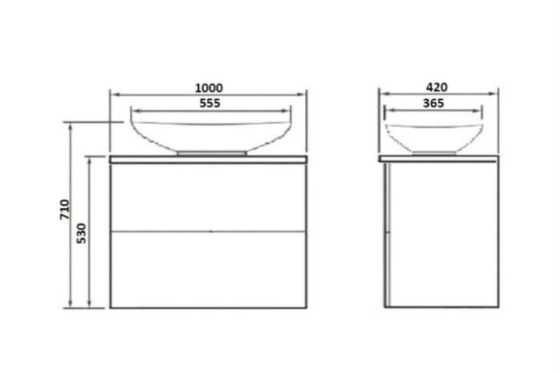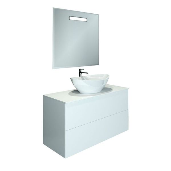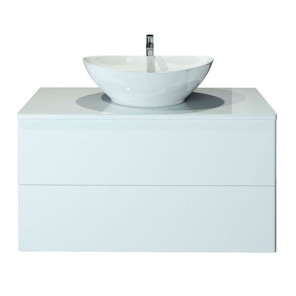 Подвесная тумба с раковиной-чашей и стеклянной столешницей, с двумя выдвижными ящиками. Предназначена для использования в ванных комнатах с повышенной влажностью. Система Push to Open: ящики открываются нажатием на них. Высокое качество сборки, материалов и фурнитуры. Корпус и фасад: МДФ, плёнка ПВХ белая глянцевая. Раковина накладная (глубина 10 см) - фаянс. Столешница: стекло окрашенное.