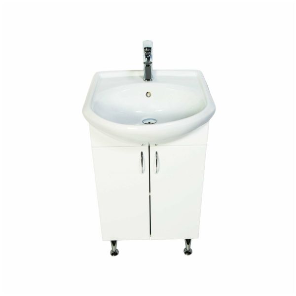 Напольная тумба с раковиной. Дверки c механизмом доводчика, обеспечивающим плавное закрывание. Фасад МДФ в пленке, цвет белый глянец. Корпус ЛДСП - белый глянец. Раковина - фарфор. Фурнитура в цвете хром. В комплекте н-р ножек и внутренняя полочка. Зеркальный шкаф для комплекта (арт. LA-45TUW+RA) приобретается дополнительно.
