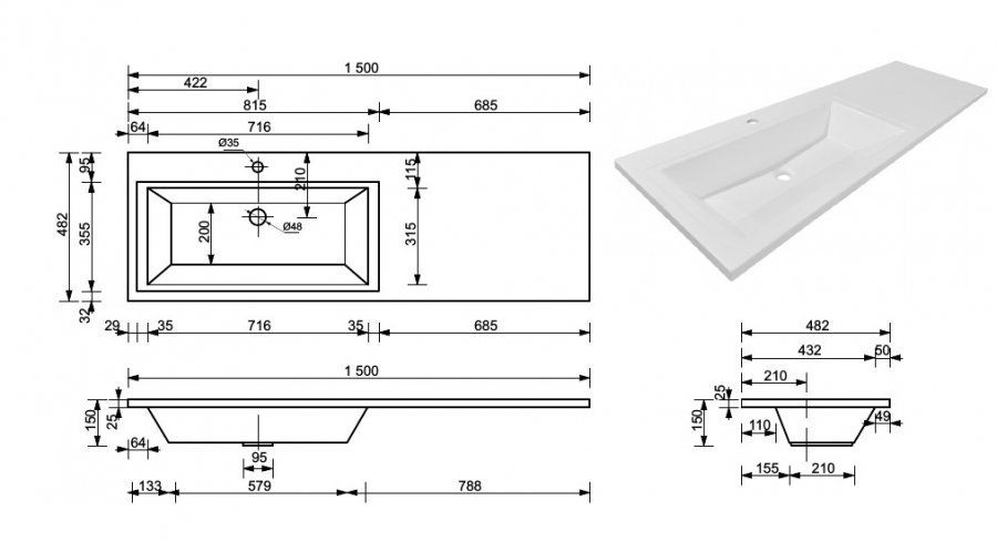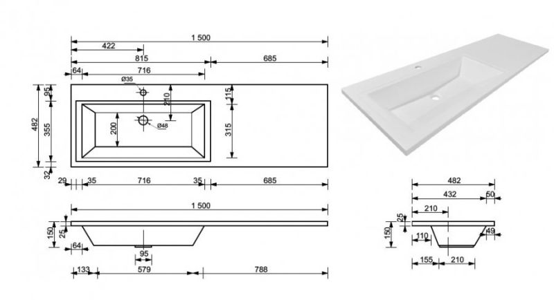 Тумба с раковиной Style Line Даллас 150 Люкс Plus напольная, левая, 3 ящика, белая, СС-00002305Размеры (ШхВхГ): 150 х 87 х 48 см